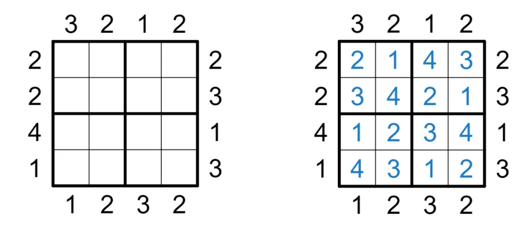 将数字 1-4 填入空格,使得每行、每列及每个粗线宫内数字不能重复。盘面外提示数表示从该位置向盘内看可以看到的楼房的个数,盘面内每个数字表示一座楼房 ,数值大小表示楼层的高度, 楼层高的楼房会挡住楼层矮的视线。