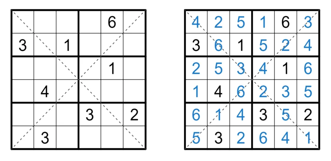 将数字1-6填入空格内 , 使每行、每列、每宫以及两条对角线上的数字均不重复。
