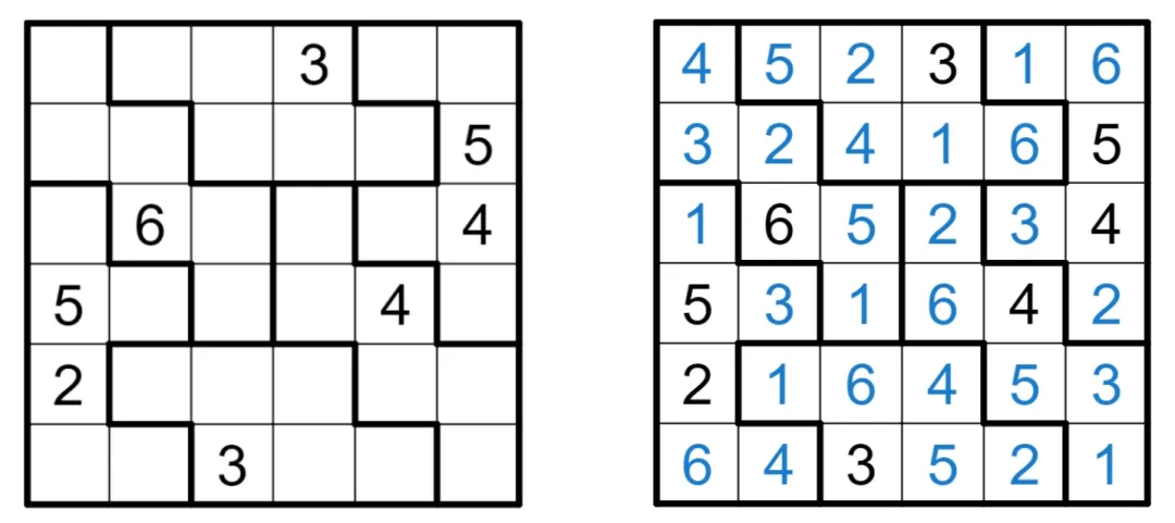 将数字1-6填入空格内, 使每行、每列、每个不规则粗线宫内的数字均不重复。