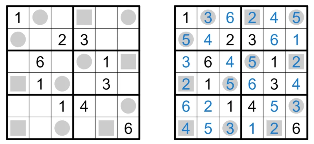 将数字1-6 填入空格内 , 使得每行、每列 、每宫内数字均不重复 。含正方形的空格内只能填偶数( 2、4、6 ) ,含圆形的空格内只能填奇数 ( 1 、3 、5 )
