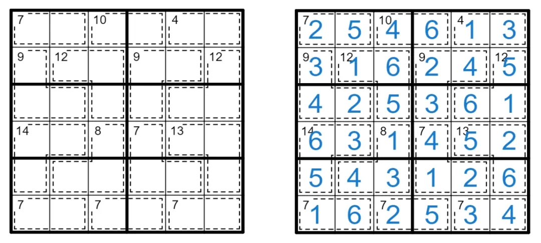 将数字1-6填入空格内,使每行、每列、每宫以及两条对角线上的数字均不重复。虚线框内提示数表示该框内所有数字之和, 同一虚线框内不能出现相同的数字。