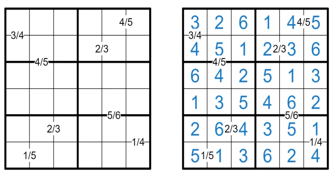 将数字1-6 填入空格内 , 使得每行、每列 、每宫内数字均不重复。虚线框内提示数表示该框内两个数字的比例。