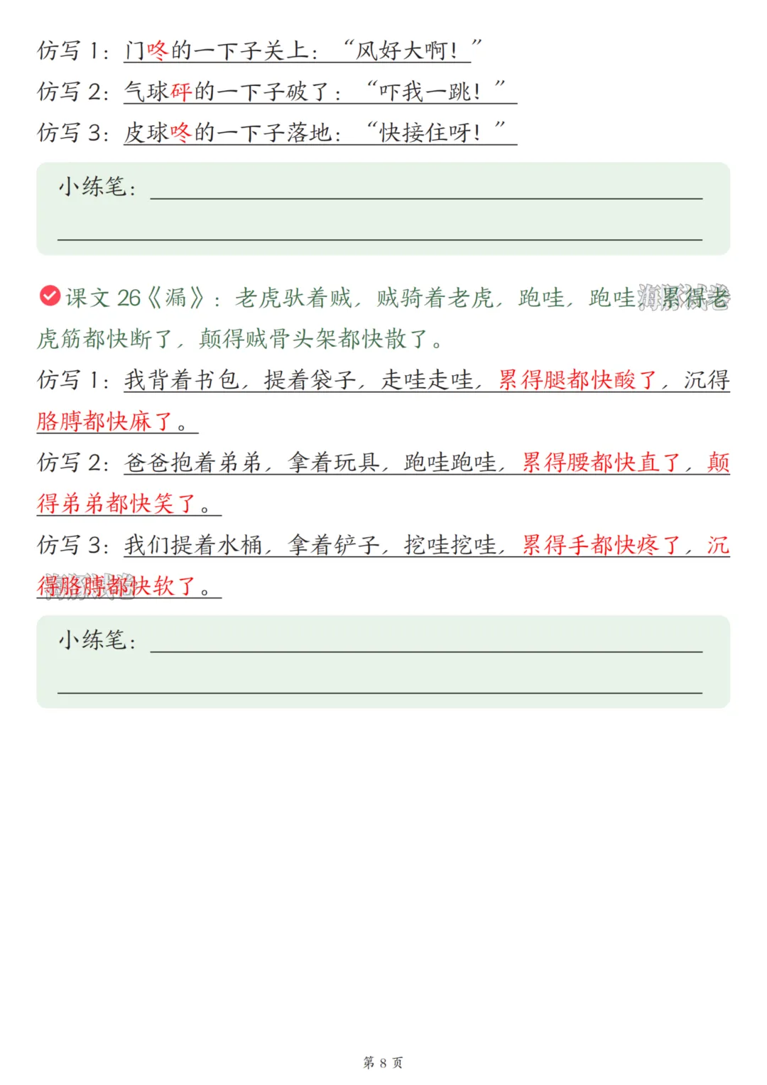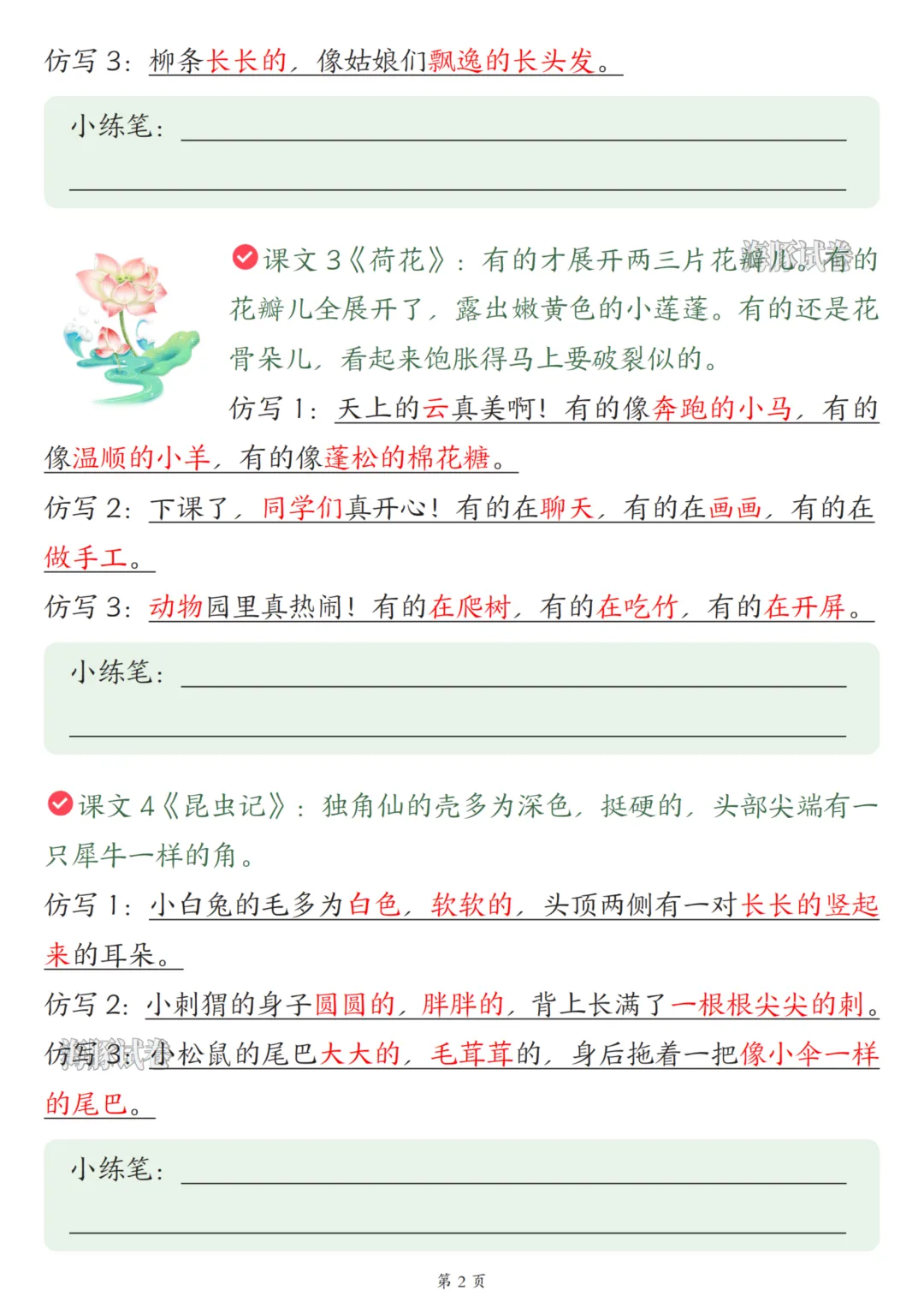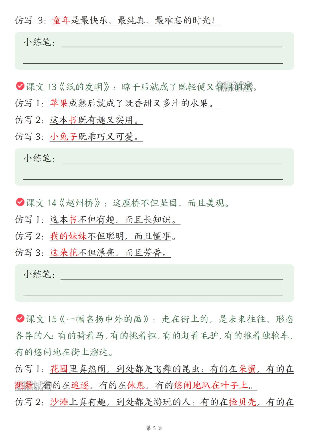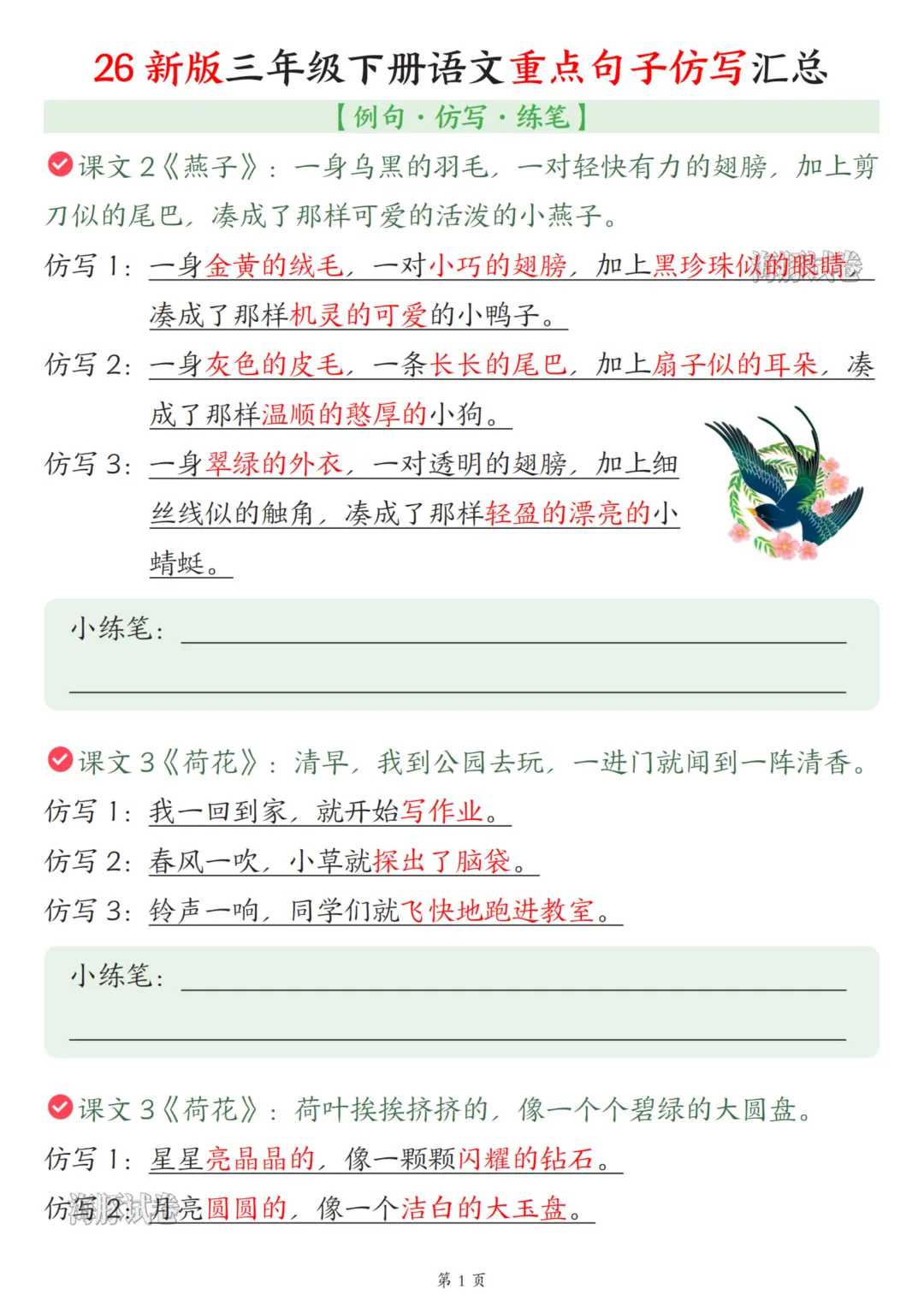 26新版三年级下册语文《重点句子仿写》汇总,电子版可打印。这份26新版三年级下册语文《重点句子仿写汇总》,紧扣全册课文重点句式,配套例句、仿写示范和小练笔,孩子跟着学、照着练,轻松掌握仿写技巧,写作基础越打越牢,家长辅导也更省心。需要的家长赶紧打印出来,给孩子练习吧!
