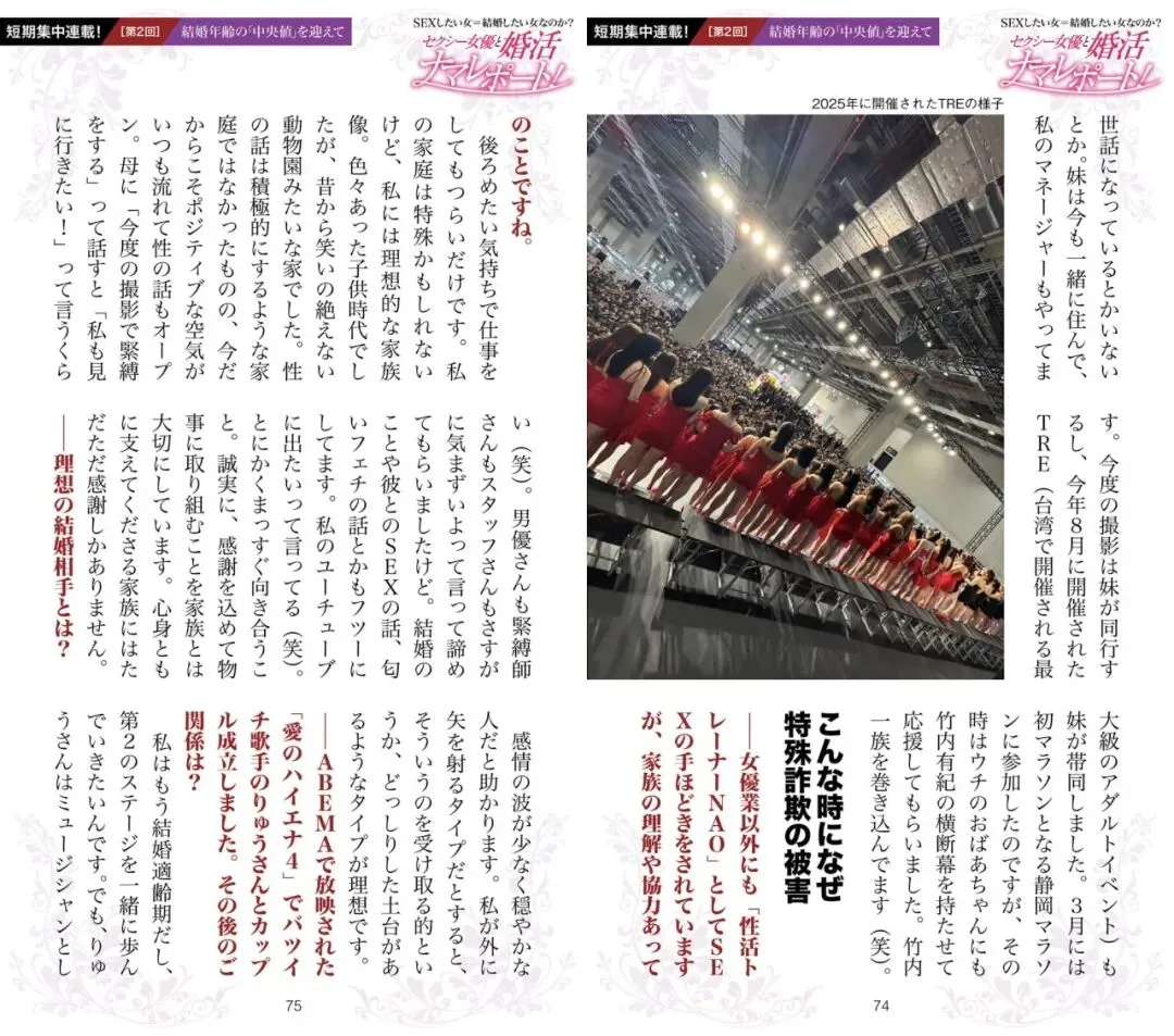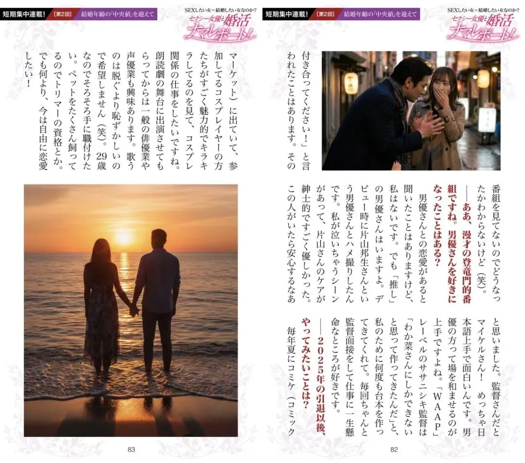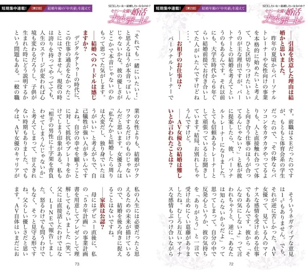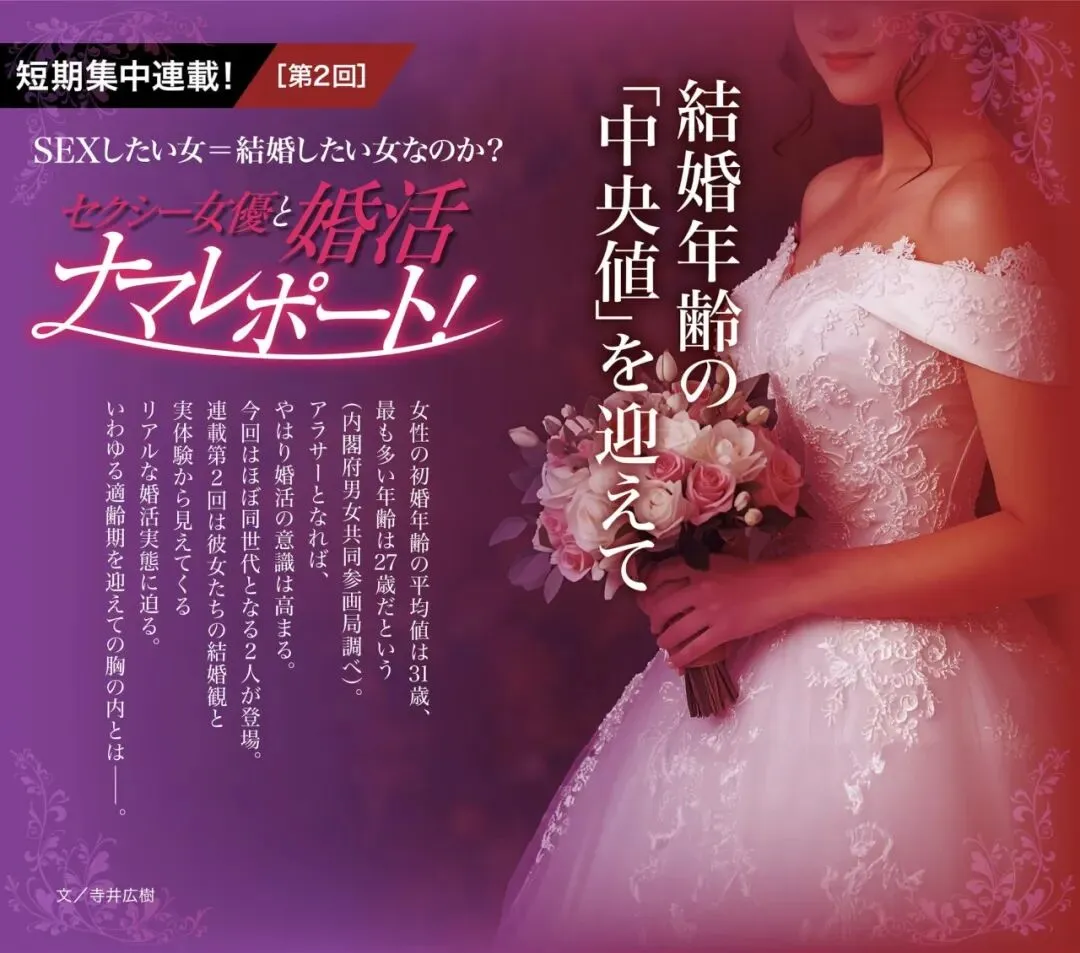——「我想和你结婚」这种话,我已经听腻了。我已经不是小孩子了,我有很强的自主性,也会为自己的幸福负责。我对印象和数据没有任何抵抗。「相亲对象的男性背负着偏见」这种说法,我完全不认同。无论什么时代,被依赖都是幸福的。现在,我依然以 AV 女演员的身份活跃着。