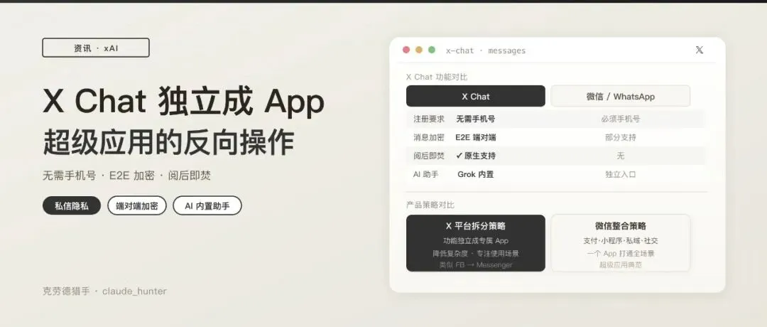 X Chat 是一个定位清晰但挑战不小的产品。「无需手机号」是真实的差异化,对 X 的现有用户群有吸引力;但安全承诺存疑、生态尚未成熟、切换成本不低——这些都是它面对 WhatsApp 和 Telegram 时需要跨越的门槛。马斯克超级应用的路线能不能跑通,X Chat 是重要的一步,但还不是决定性的一步。 |