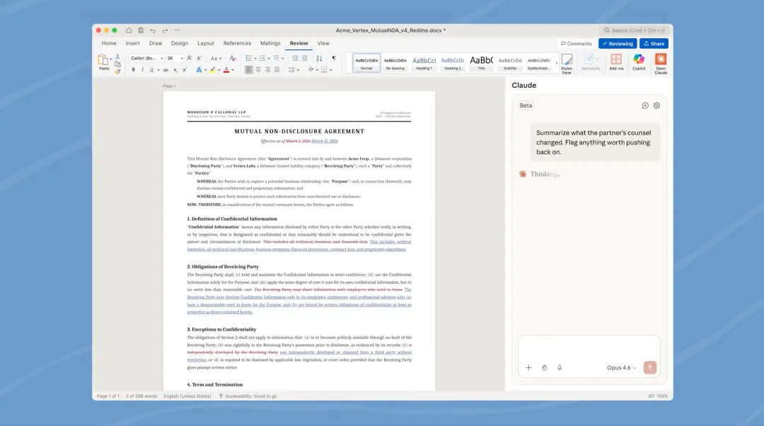 有了 Claude for Word,无需再切换到单独的聊天窗口。用户可以始终停留在文档内部:高亮文本、留下批注或描述编辑意图,Claude 会以修订模式进行修改,同时保持所有格式和样式不变。