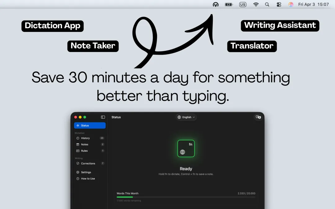 如今,它做到了大多数人需要用四个不同应用来完成的事情——听写、笔记、翻译和 AI 写作助手。一个热键。在你 Mac 的任何地方都可用。