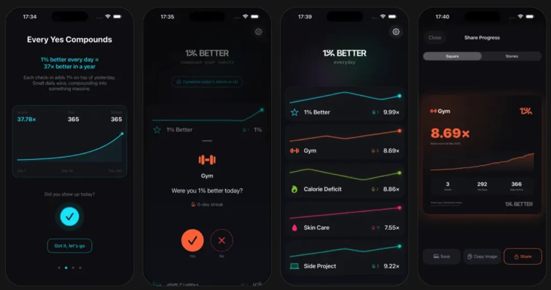 唯一一款围绕复利数学构建的习惯追踪应用。如果你每天进步 1%,一年后你将比今天好 37 倍。该应用将习惯追踪简化为一个问题:“今天你进步了 1% 吗?” 只需回答是/否,然后看着你的图表呈指数级增长。它设计极简、隐私优先,并鼓励你坚持习惯。因为习惯追踪不应感觉像一份数据录入工作。