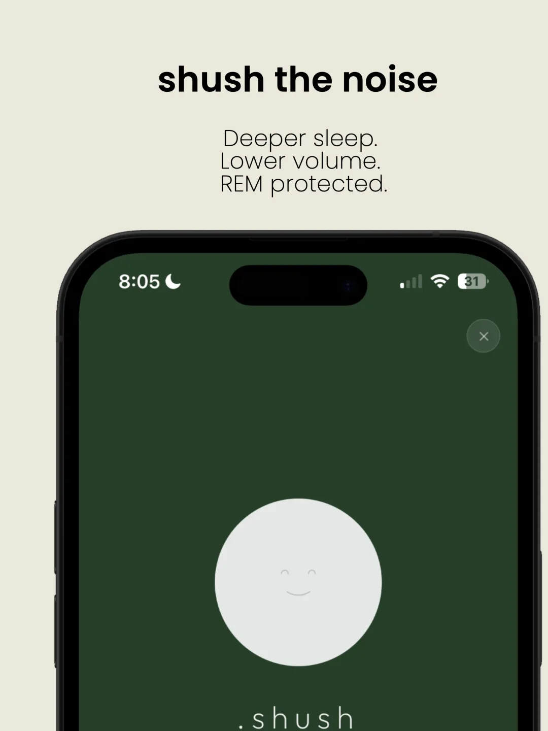 Shush 首先聆听你的房间,从其输出中移除那些频率,并只生成缺失的部分。更低的音量。完整的频谱。更好的睡眠。