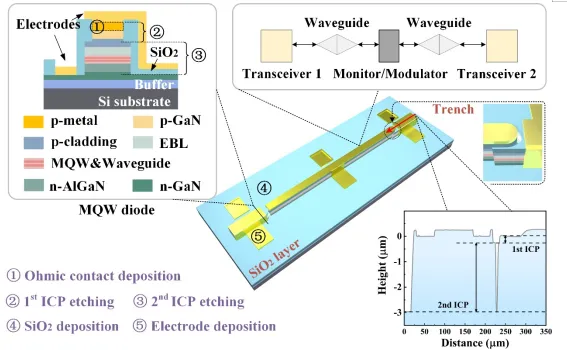 该论文基于量子阱二极管发光探测共存现象,采用硅基氮化镓晶圆,探索兼容制造工艺,在同一芯片上集成了光发射器、光波导、监视器/调制器以及光接收器,研制出硅基氮化镓通感一体化全光芯片。研究人员创建物质时空质能理论,提出在宇宙质能守恒、光速不变和等价性原则下,物体的能量、质量、时间、空间等物理量存在动态等价、互逆、全映射的转换关系。根据这一理论,研究人员利用量子阱二极管特有光发射和光接收功能互逆性,采用时分复用技术,实现单氮化镓光波导全双工通信,通信节点具备对称、去中心化和可切换的网络特征。在反向偏置或内建电场的作用下,集成在波导上的量子阱二极管可用作光调制器或光监视器,用于调制、感知波导内部的传输光。图1为该氮化镓通感一体化全光芯片的原理图。