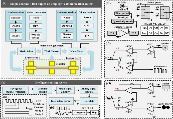 图2 氮化镓通感一体化全光系统原理图。(a)单通道TDM双工片上光通信系统示意图;(b)智能感知系统示意图;(c)系统内部逻辑电路:(c1)TDM切换方案的内部逻辑电路,(c2)收发节点1的外围逻辑电路,(c3)收发节点2的外围逻辑电路。
