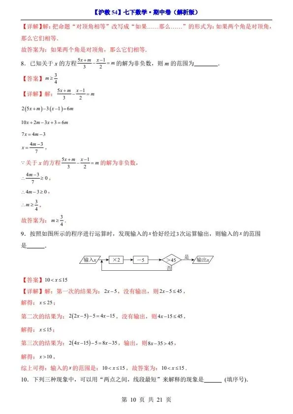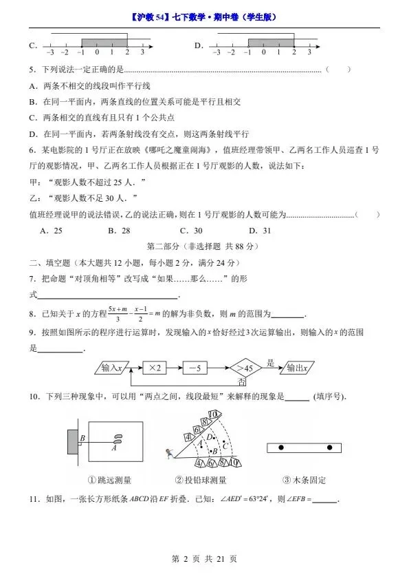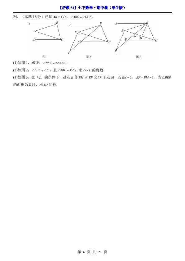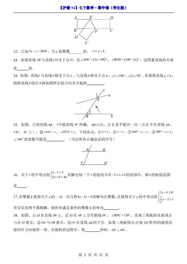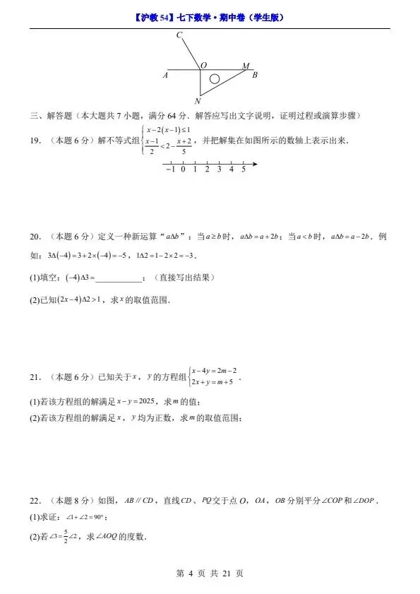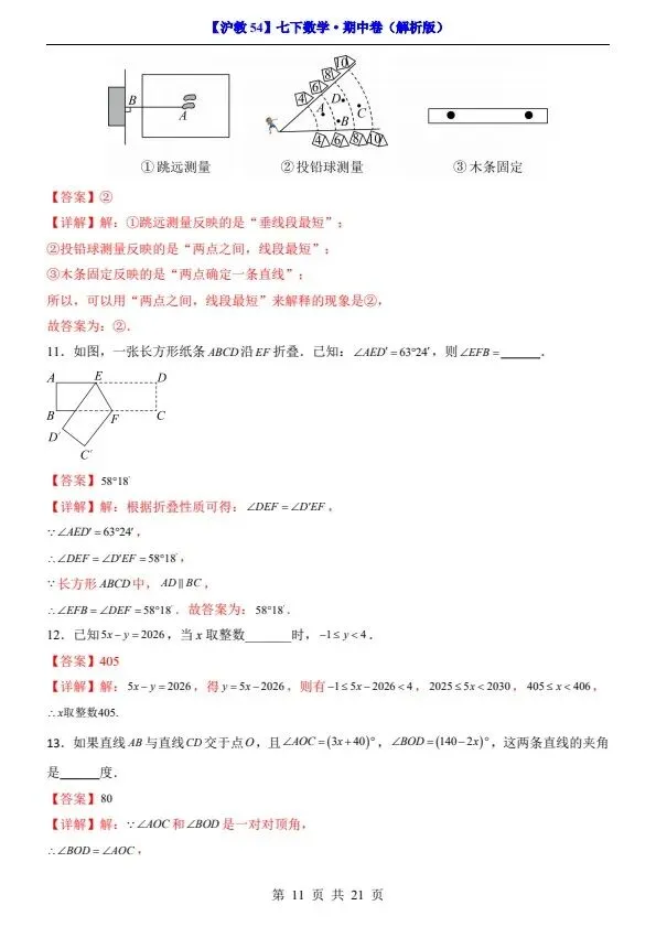 26春七年级下册沪教54版数学期中试卷(答案+答题卡)完整电子版可打印