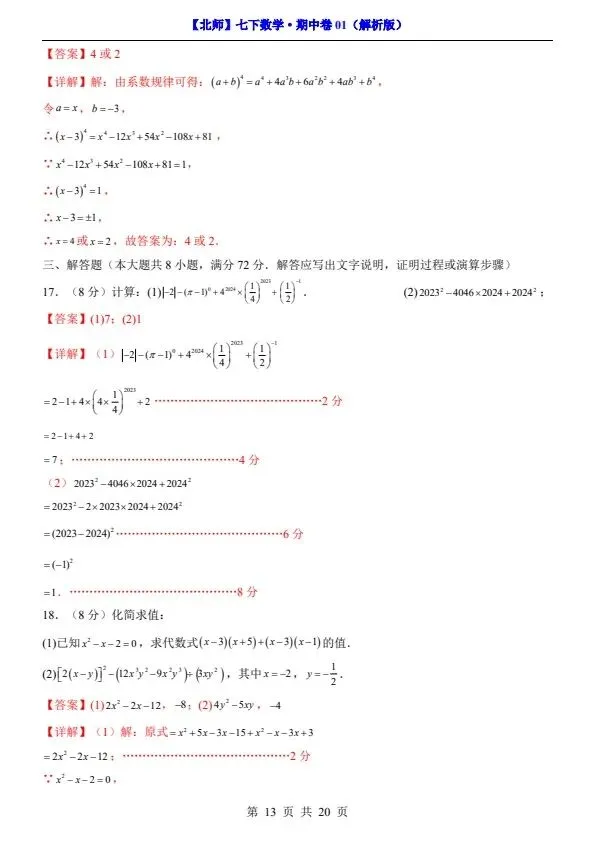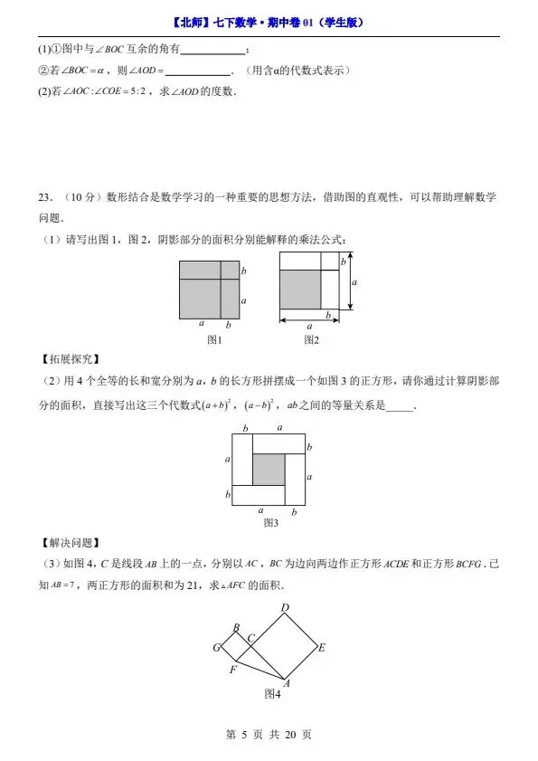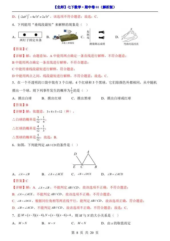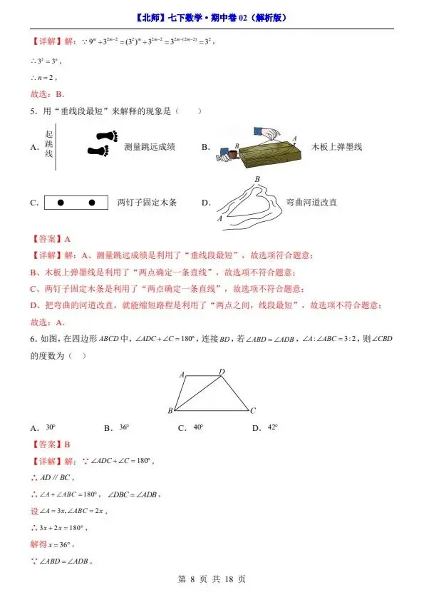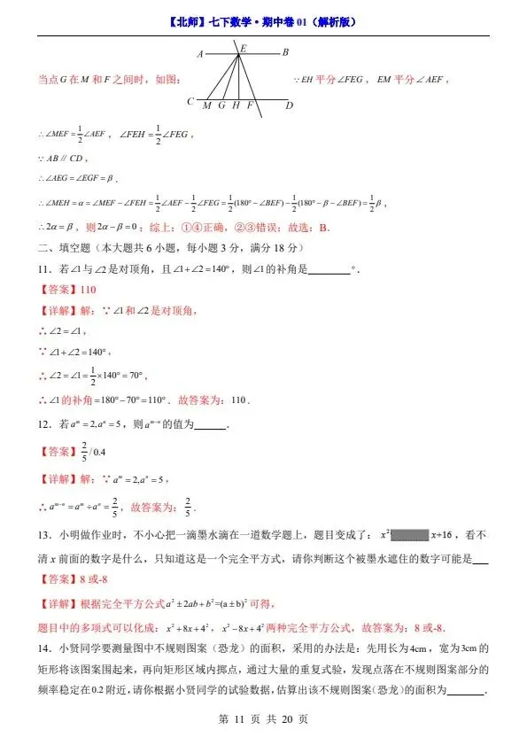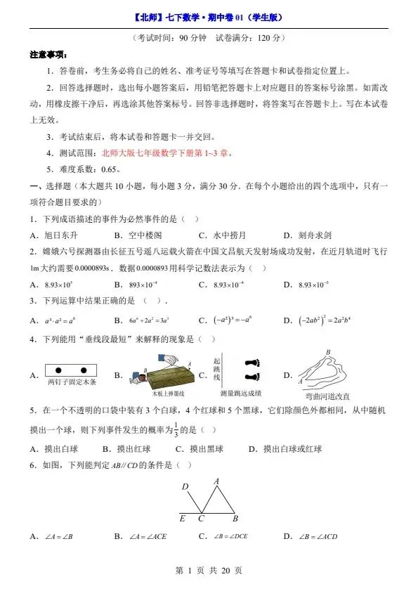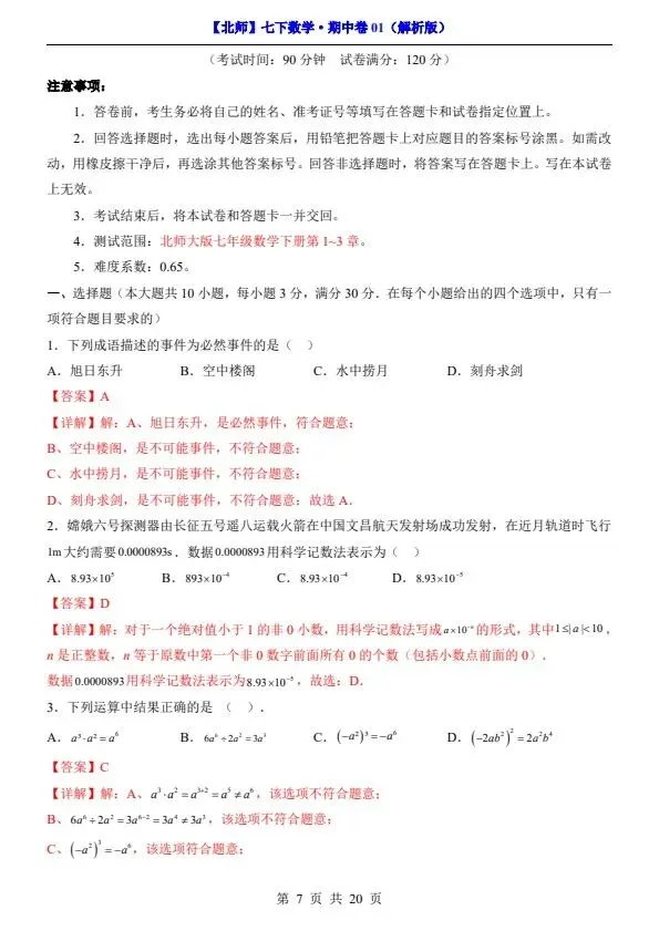 26新七下数学北师版期中试卷2套含答案+答题卡(完整电子版可打印)