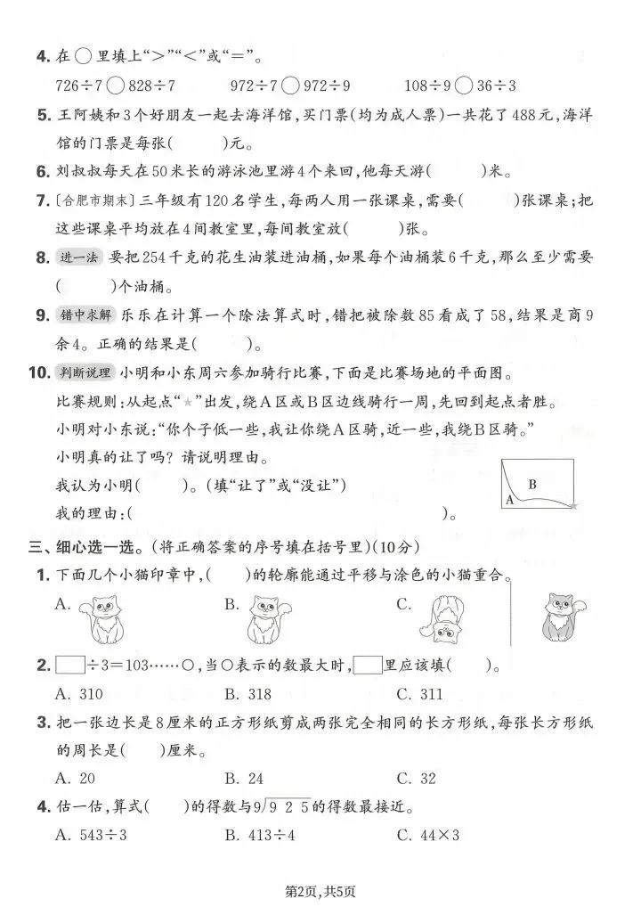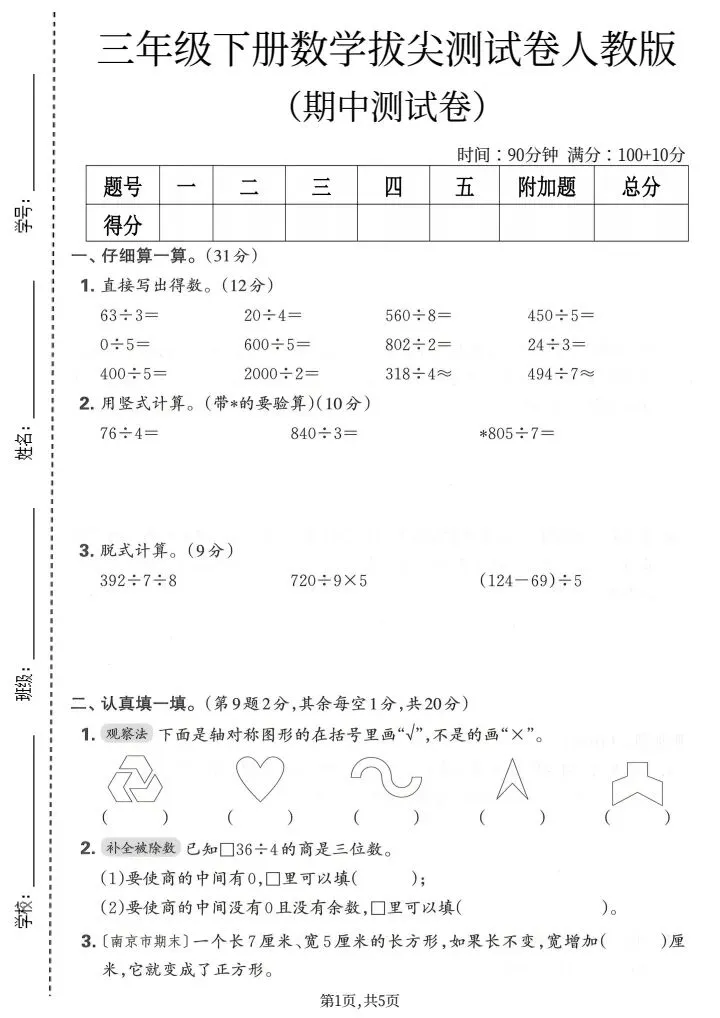 三年级下册数学期中测试卷|完整电子档可下载打印!
