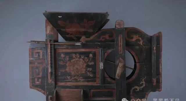 图中这木头黑漆的家伙叫风车扇车,正面还画着两笔牡丹花,箱体有点方,顶上的斗子能盛一小堆粮,侧边开个口子怕你认不出来,手柄一摇,那风页哗啦啦地转,粮米从一个口子出来,糠壳走另一个口子,小时候站在旁边接米,风一吹,糠皮飘得跟下雪似的,爷爷叼着烟斗说慢点,别撒,整个场院安安静静只剩粮食下来的脆生声,现在机器一插电不用人操心,那种手把手的劲头也就没了。