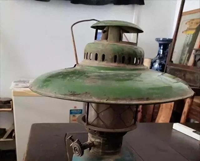 顶上大檐的这个叫汽灯,绿色的帽子一扣立马不一样,拧开油壶加煤油,手柄咔咔一气打下去,灯丝一亮,整个屋里都透着白光,冬天晚饭后,靠它做作业,玻璃罩上沾着一圈黑渍,家里大人总念叨油省着点,别开太大火苗,现在灯泡一拧满屋亮,以前的煤油味儿可搁不住谁睡一宿。