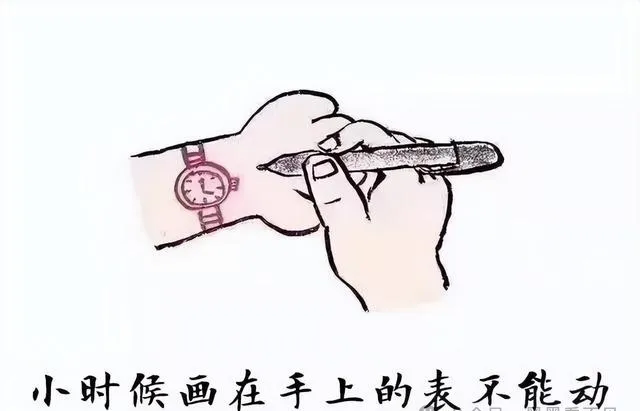 小时候手头没手表,干脆自己拿圆珠笔在手腕上画表盘,刻度、指针都到位,虽然什么都不会走,心理总觉得和别人一样有派头,那时候谁真能戴块电子表,回头率得翻天,这种画的表现在想起来都是小孩子藏不住的乐呵劲。