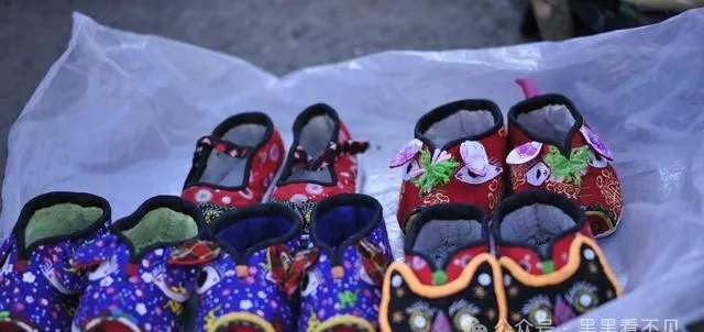 这一排小鞋子,最显眼的就是虎头鞋,鞋面绣着胡须和虎眼,颜色红红绿绿,小孩穿上脚跟都翘起来,过满月、满周,奶奶准得做上一双,边缝边念,穿虎头走路有劲,冬天鞋里塞点棉花,暖和,花样都是家里女人一点点攒出来的,现在市面上见到都是拿来做纪念的,真正脚底踩过好几个月的,没几个了。
