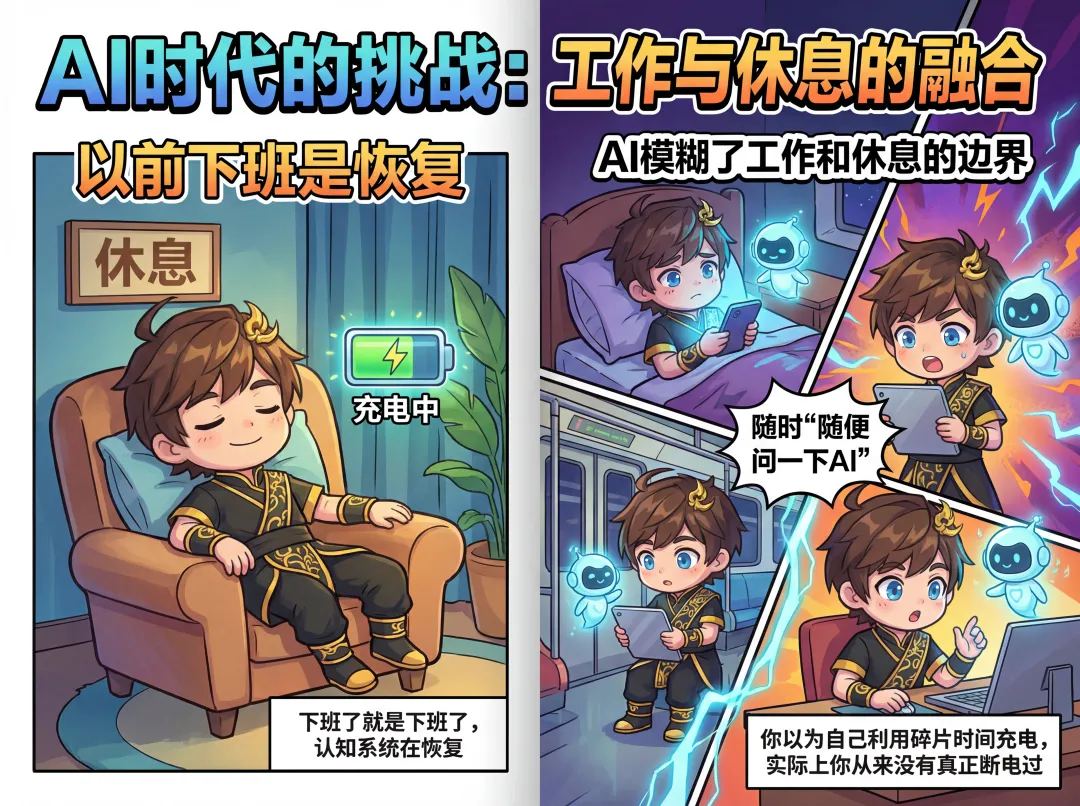以前下班了就是下班了,你的认知系统在恢复。现在你的手机里永远有个AI助手,你可以在任何时刻——睡前、地铁上、周末——”随便问一下AI”。