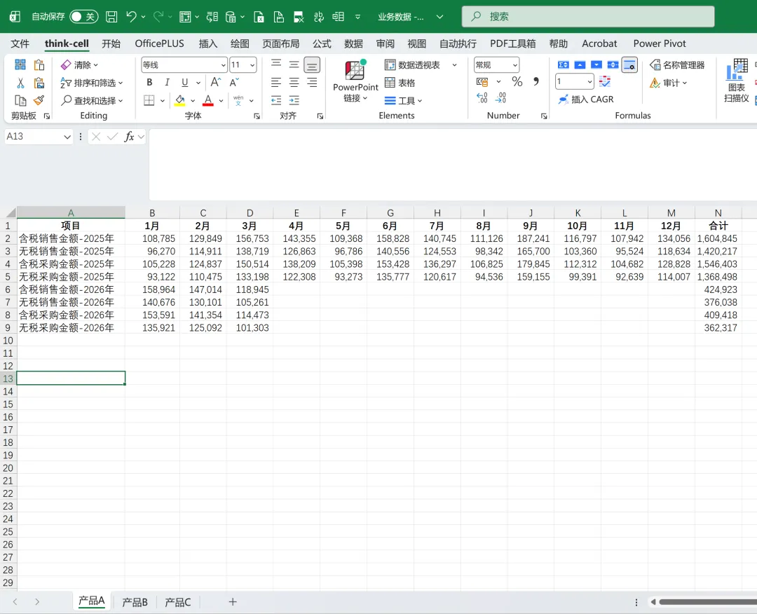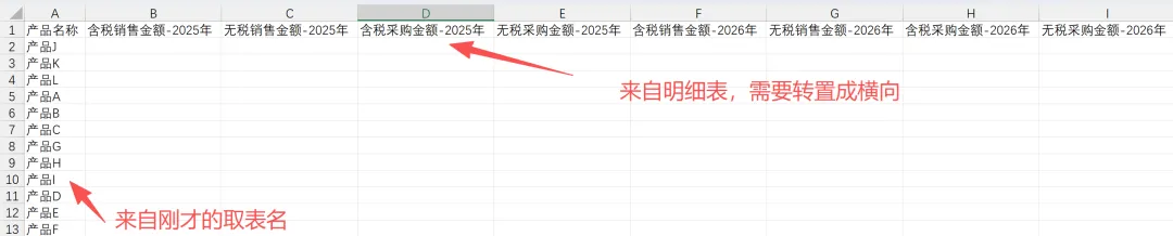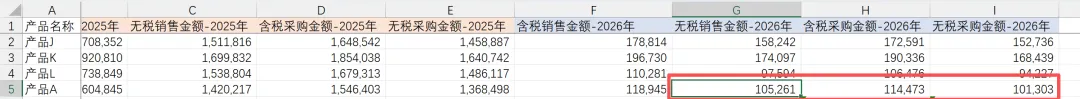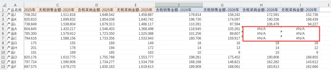 我们定位到产品A/产品B/产品C对应的明细表,发现项目名称中,2026年的采购数据被人为修改成了“采购额”,而非“采购金额”,导致匹配不一致