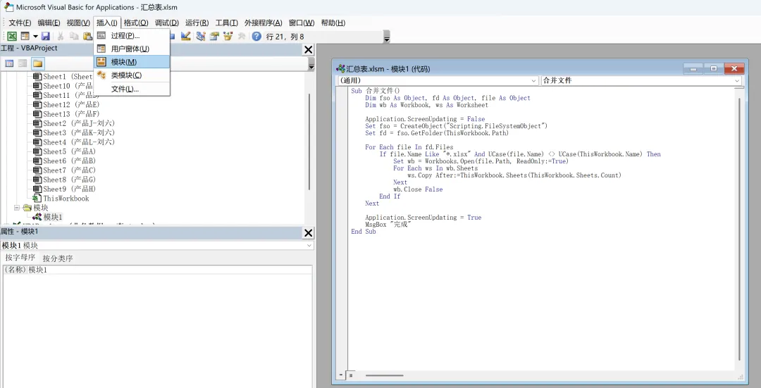 在插入选项卡的下拉菜单中点击模块,并输入代码