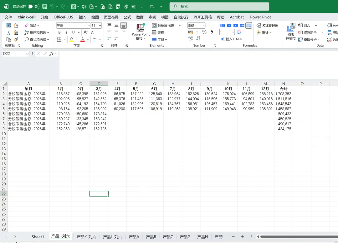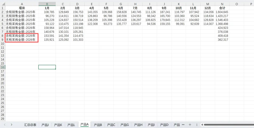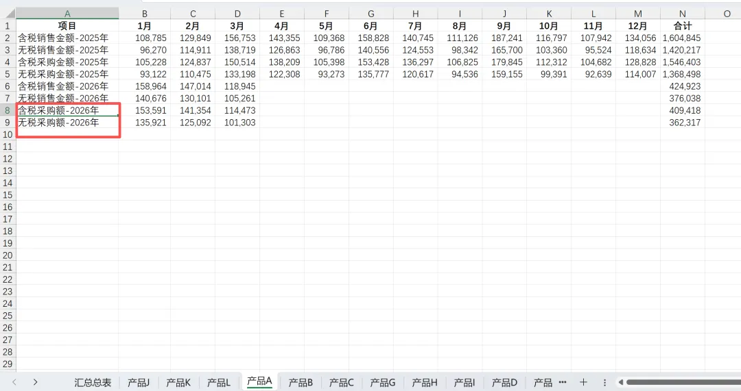 列:固定项目(含税/无税销售、含税/无税采购,分2025/2026)