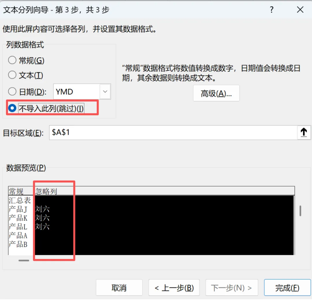 点击下一步,选中“刘六”对应列,选择“不导入此列(跳过)”
