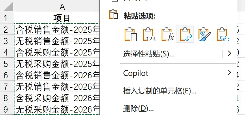 复制明细表中的项目,并使用粘贴的转置功能,粘贴到汇总总表的列上