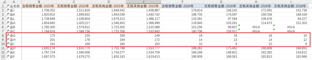 都汇总完之后,财务分析/财务BP通常需要对数据的质量再次进行检查。此时我们发现产品G/H/I数字特别小,就需要和对应业务员李五沟通原因
