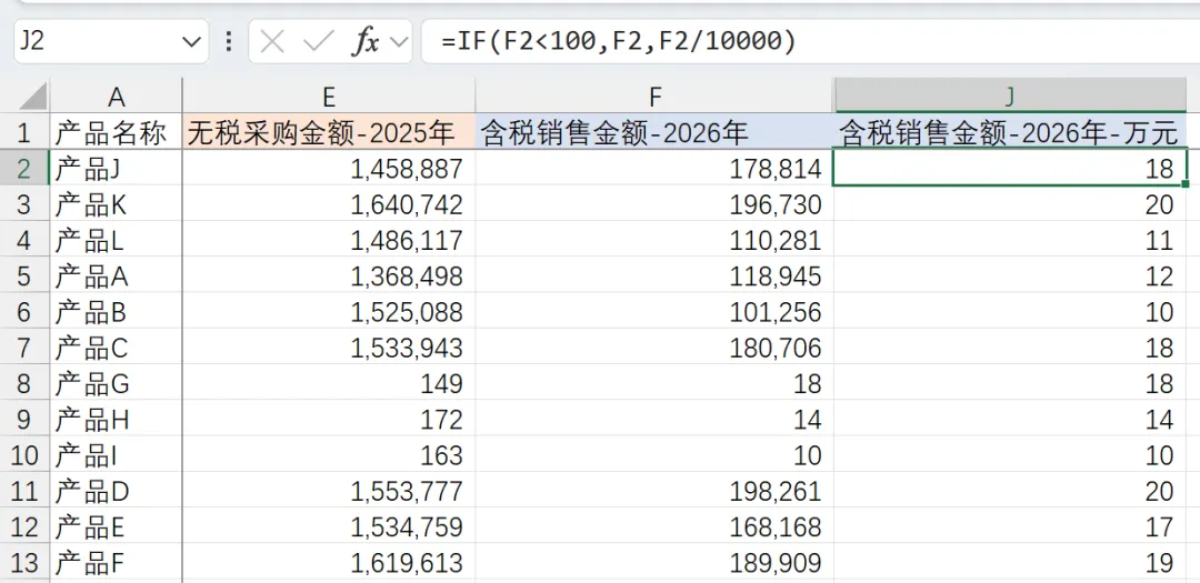 方法:用IF自动判断,统一为万元