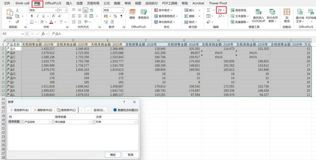 现在的汇总总表,产品名称是乱序的,需要调整成和字母表顺序一致,使用自定义排序功能: