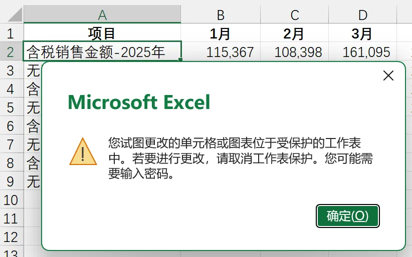 修改单元格时,会报出如下提示,没有密码无法修改单元格