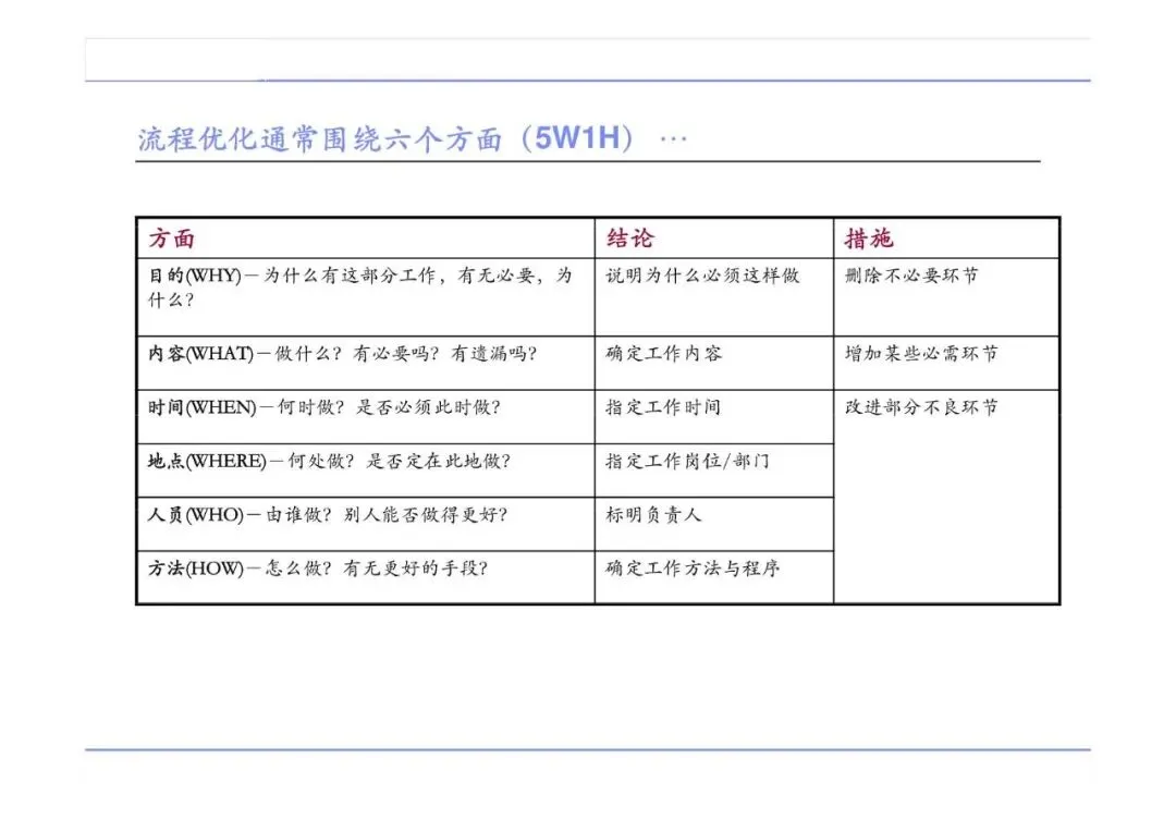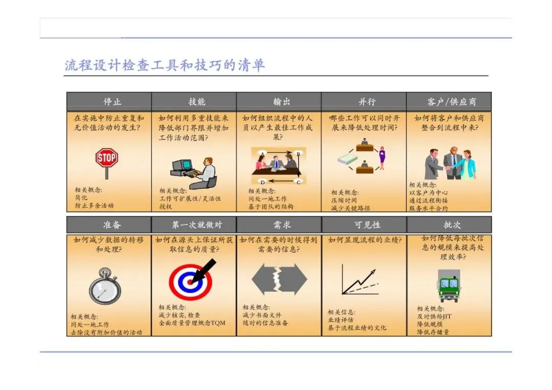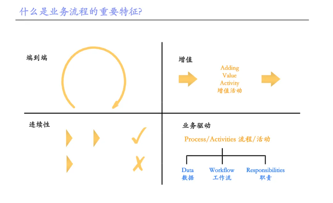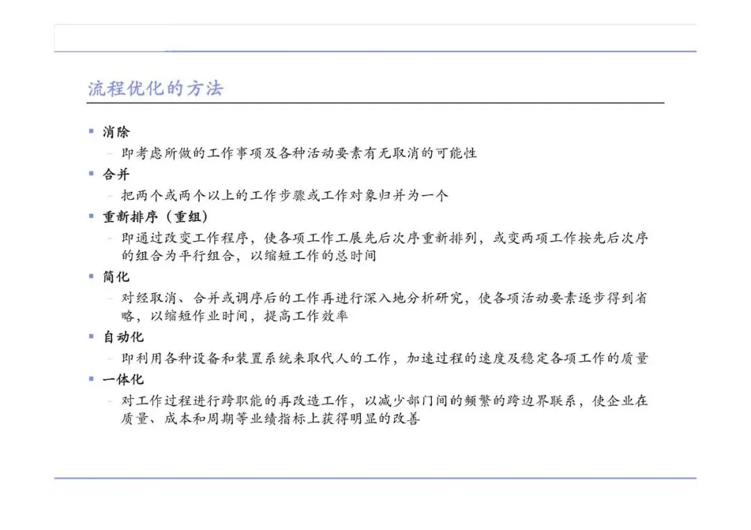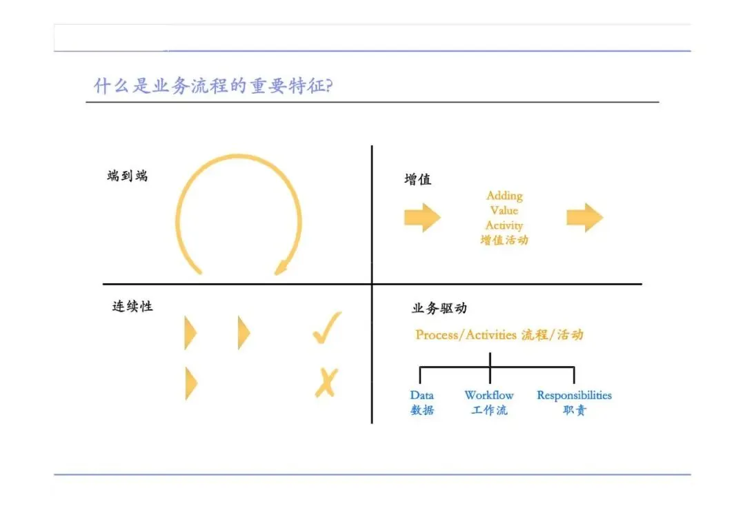 方案提炼的四大特征——端到端、增值、连续性、业务驱动——构成了评估流程健康度的核心维度。“端到端“强调流程必须跨越职能边界,从客户需求出发回到客户价值交付;“增值“要求每个活动都对最终产出有贡献,消除不增值环节是优化的核心任务;“连续性“关注步骤间的无缝衔接,避免断点和等待;“业务驱动“明确流程设计的出发点是业务需求而非系统约束。这四个特征形成完整的评价框架:端到端解决“范围“问题,增值解决“质量“问题,连续性解决“效率“问题,业务驱动解决“方向“问题。在数字化转型中,这对应着数据贯通、价值量化、实时协同和以客户为中心的四大数字化能力。