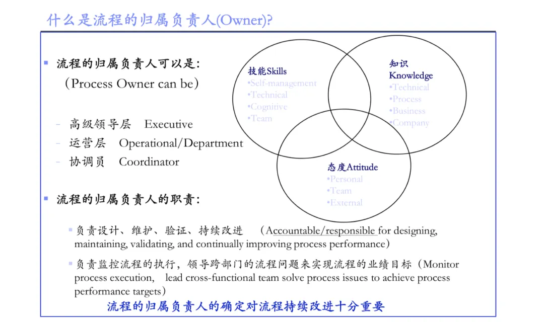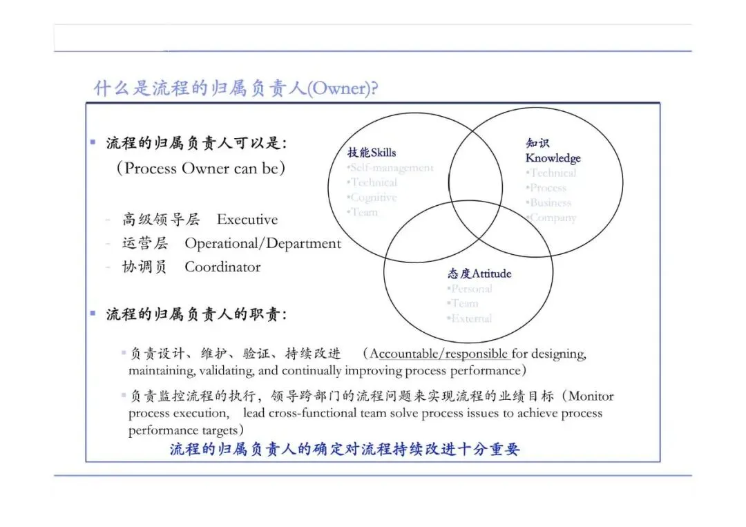 方案特别强调“流程的归属负责人的确定对流程持续改进十分重要“,这一机制解决了流程管理中的责任真空问题。流程Owner可以是高级领导层、运营层或协调员,但核心职责统一:负责设计、维护、验证、持续改进流程,监控执行,领导跨部门团队解决流程问题以实现业绩目标。这体现了IBM的深刻洞察——流程是跨职能的,但责任必须是明确的。传统职能型组织中,流程往往“人人有责、人人无责“,而流程Owner机制通过指定明确的“流程CEO”,确保优化有推动者、绩效有承担者、冲突有仲裁者。对于数字化转型,流程Owner更是数据驱动决策的关键节点,需要从“流程的CEO”进化为“流程的数据分析师“,通过持续监控流程数据来驱动优化。