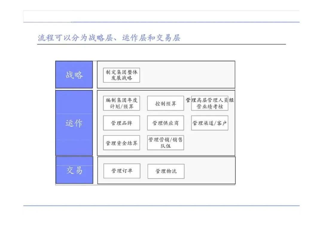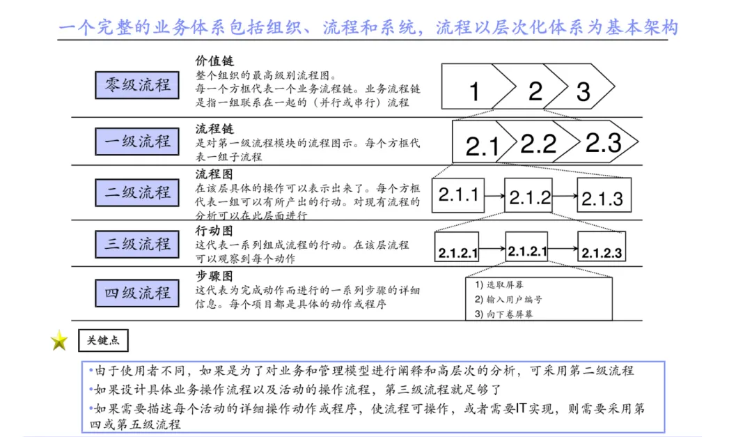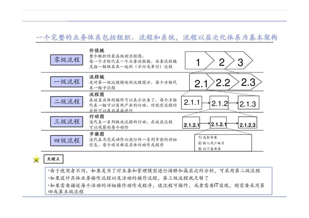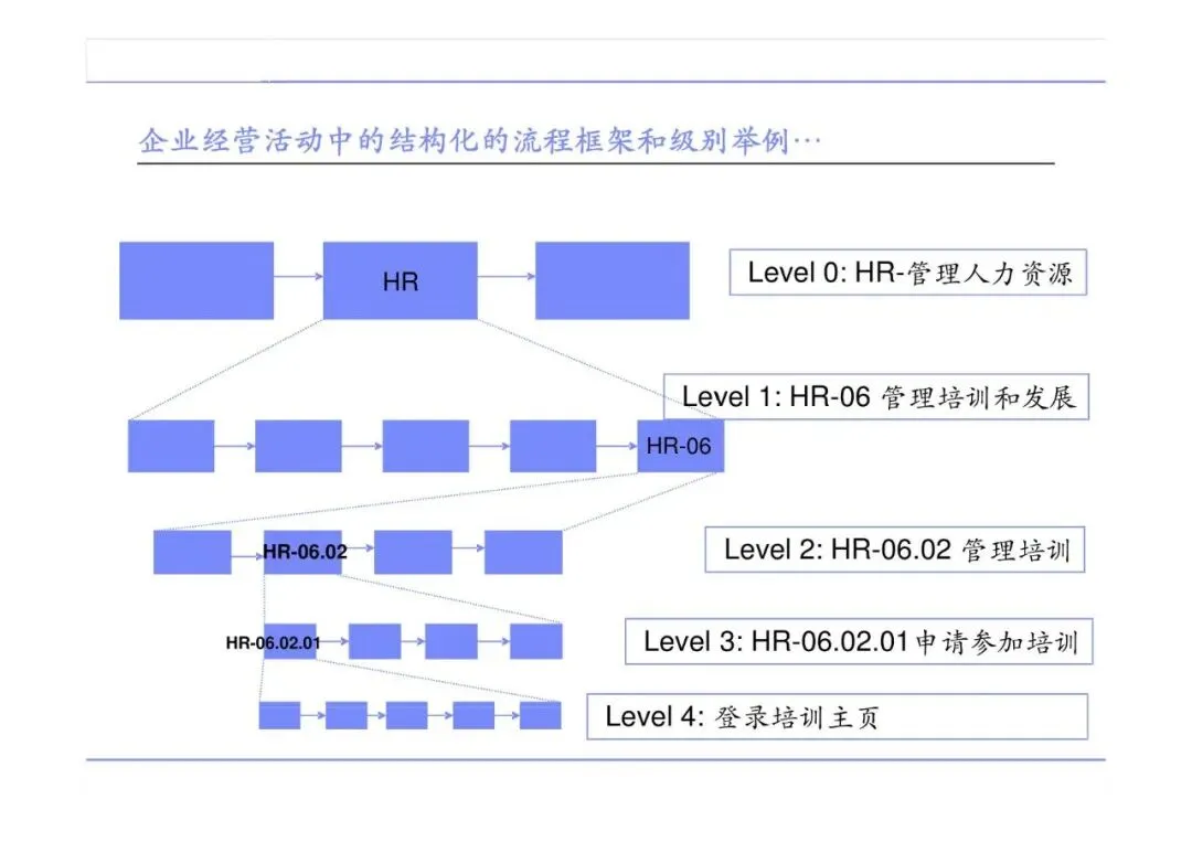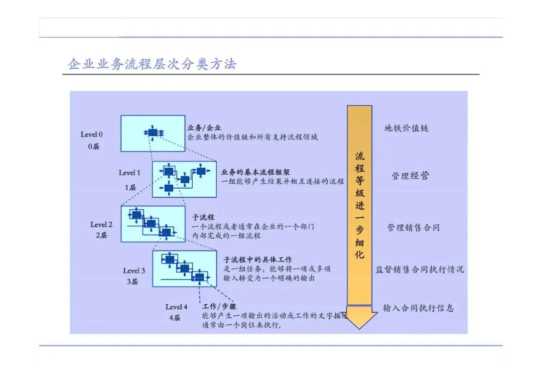 方案构建了从Level 0(企业整体价值链)到Level 4(具体工作步骤)的五层流程架构,是IBM方法论最具操作性的贡献。Level 0是企业价值链,Level 1是业务基本流程框架,Level 2是子流程(通常在一个部门内完成),Level 3是具体工作(一组任务),Level 4是工作步骤(通常由一个岗位执行)。这种分层设计解决了流程管理中的“粒度困境“——高层管理者需要宏观视角,一线员工需要操作细节,五层架构让不同层级人员都能在合适的抽象层次上理解和优化流程。“由于使用者不同,如果是为了对业务和管理模型进行阐释和高层次的分析,可采用第二级流程;如果设计具体业务操作流程以及活动的操作流程,第三级流程就足够了“。这对于数字化转型中的流程建模具有直接指导意义:业务流程架构(BPA)通常映射到Level 1-2,而工作流自动化(BPM)则聚焦Level 3-4。