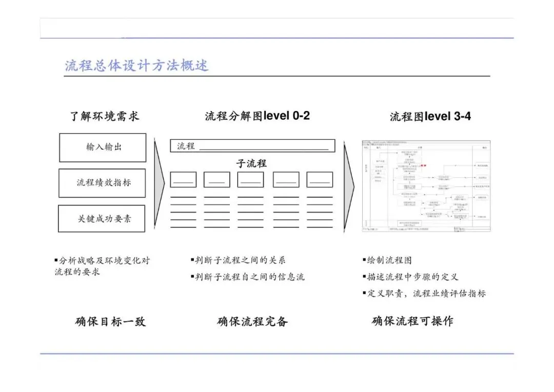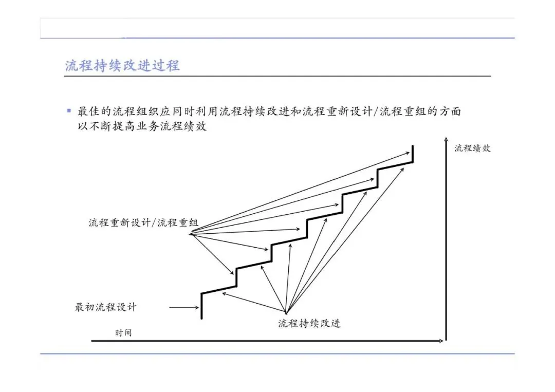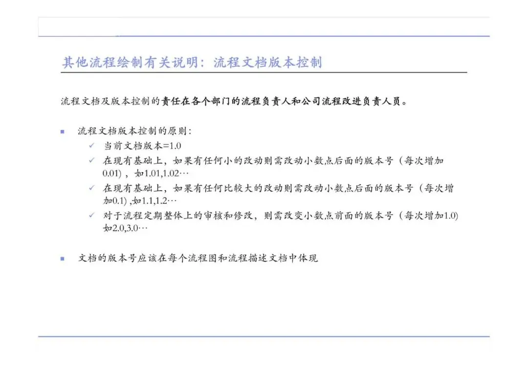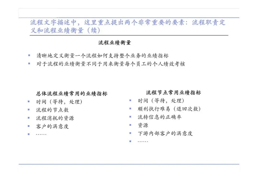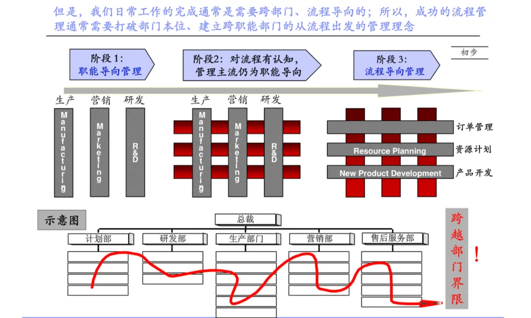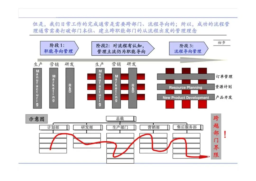 方案用清晰的演进路径揭示了管理的本质变革:阶段1是职能导向管理,阶段2是对流程有认知但管理主流仍为职能导向,阶段3是流程导向管理。这不是简单的工具升级,而是管理哲学的根本转变——从“部门本位“到“流程本位“,从“垂直管控“到“横向协同“。方案尖锐地指出“很多时候,人们习惯于基于职能部门的管理而不是基于流程导向的管理“,这种习惯导致流程执行需要“跨越部门界限“时产生巨大摩擦。示意图中红色的跨部门流程线形象地展示了在职能型组织中完成一个端到端流程需要穿越多少部门壁垒。这对数字化转型具有警示意义:数字化系统可以固化流程,但如果管理思维仍停留在职能导向,系统只会变成部门割据的数字化堡垒。真正的流程导向管理需要“打破部门本位、建立跨职能部门的从流程出发的管理理念“,这正是数字化转型中组织变革最难但最关键的部分。