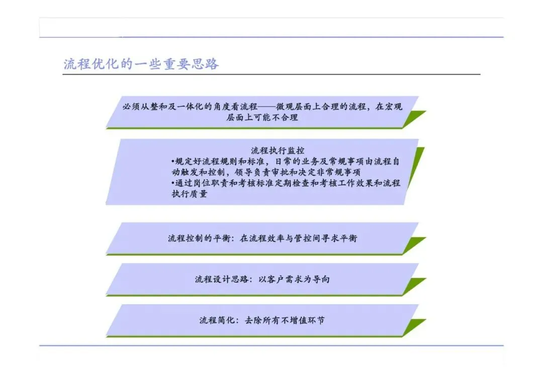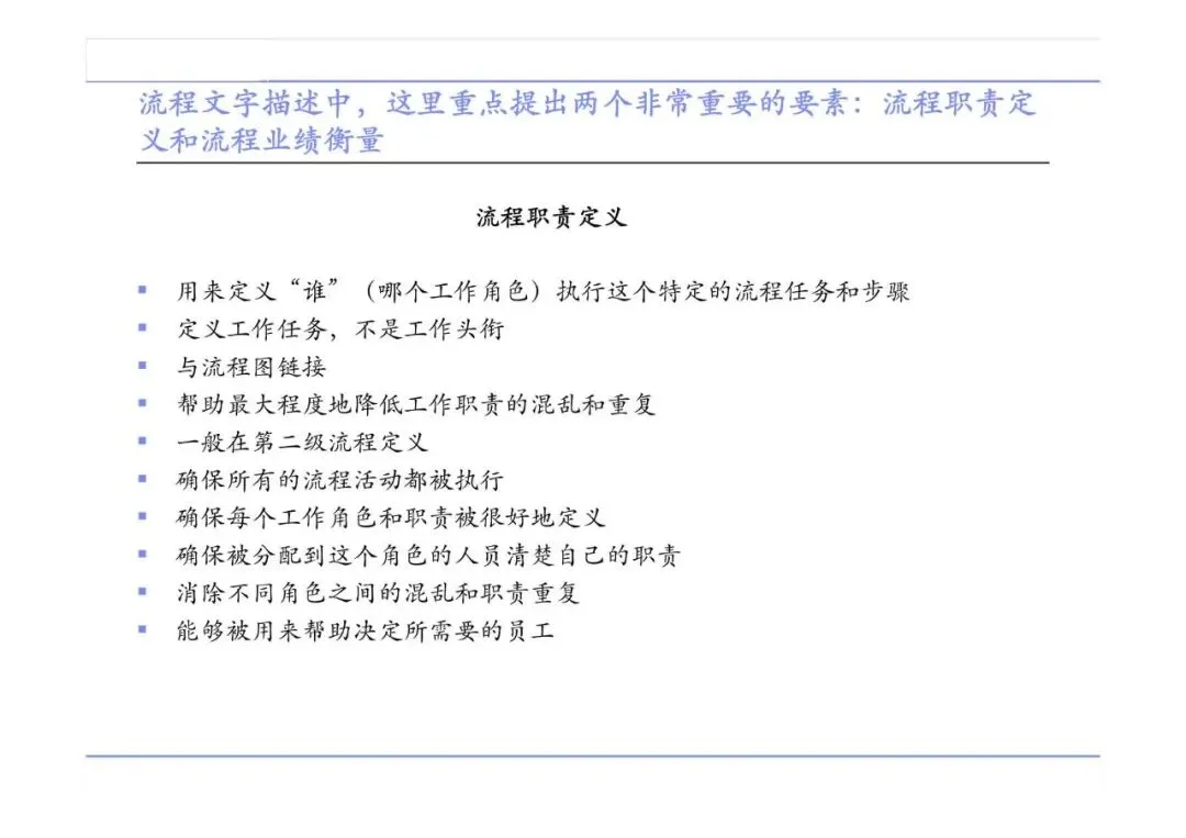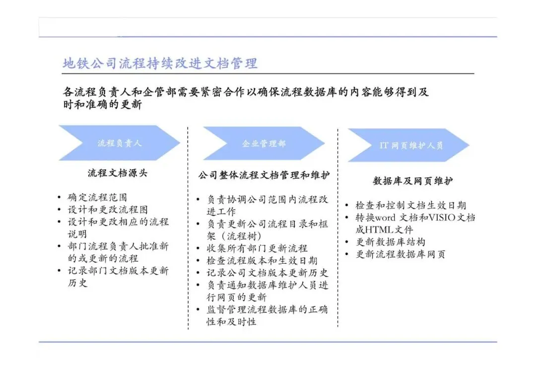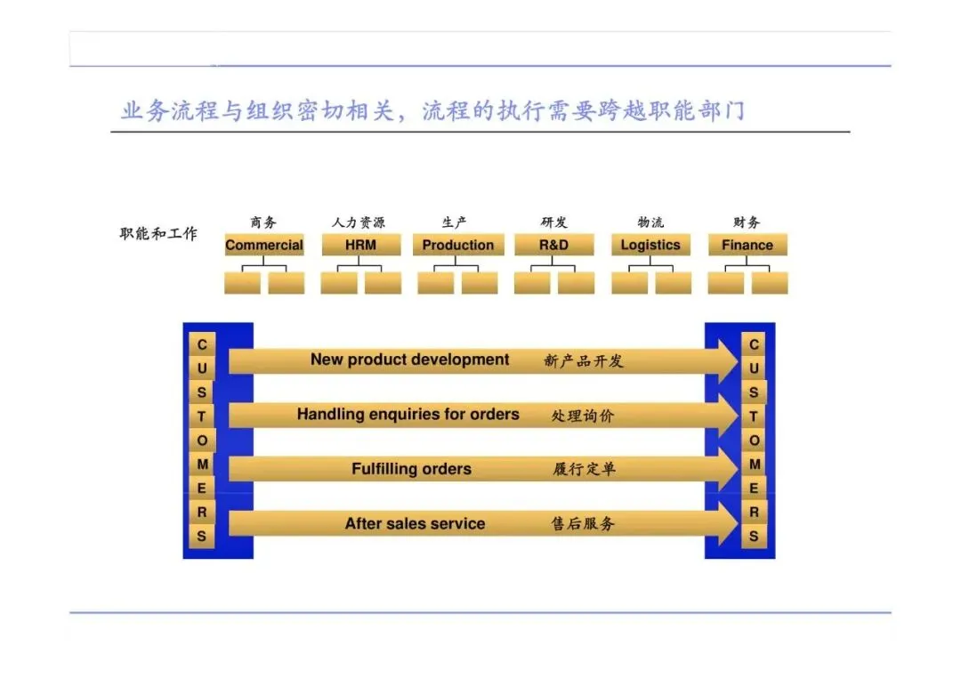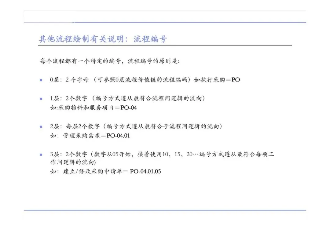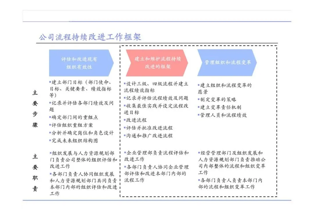 方案用清晰的演进路径揭示了管理的本质变革:阶段1是职能导向管理,阶段2是对流程有认知但管理主流仍为职能导向,阶段3是流程导向管理。这不是简单的工具升级,而是管理哲学的根本转变——从“部门本位“到“流程本位“,从“垂直管控“到“横向协同“。方案尖锐地指出“很多时候,人们习惯于基于职能部门的管理而不是基于流程导向的管理“,这种习惯导致流程执行需要“跨越部门界限“时产生巨大摩擦。示意图中红色的跨部门流程线形象地展示了在职能型组织中完成一个端到端流程需要穿越多少部门壁垒。这对数字化转型具有警示意义:数字化系统可以固化流程,但如果管理思维仍停留在职能导向,系统只会变成部门割据的数字化堡垒。真正的流程导向管理需要“打破部门本位、建立跨职能部门的从流程出发的管理理念“,这正是数字化转型中组织变革最难但最关键的部分。