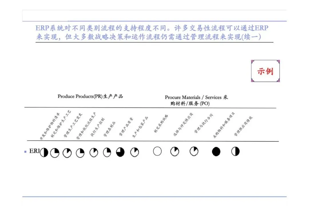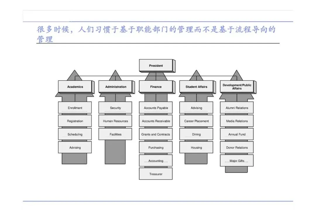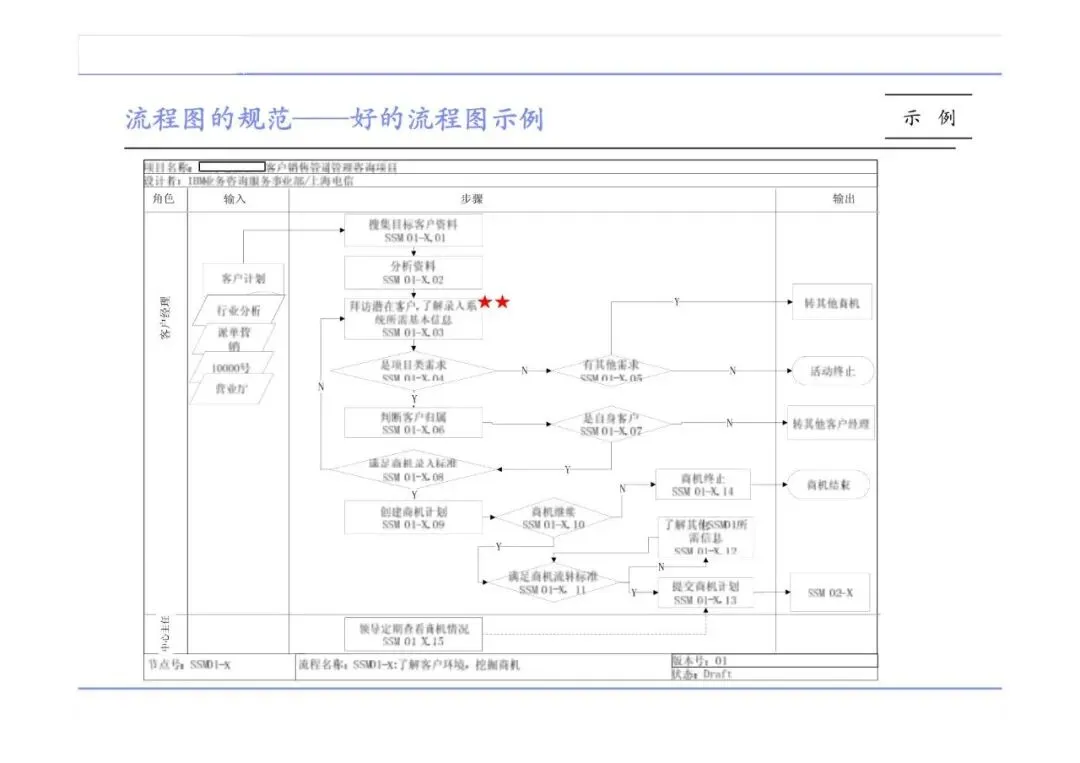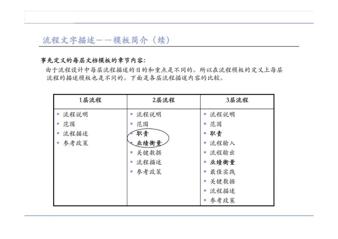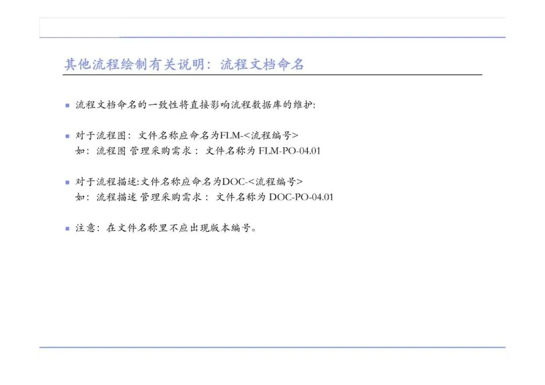 方案用清晰的演进路径揭示了管理的本质变革:阶段1是职能导向管理,阶段2是对流程有认知但管理主流仍为职能导向,阶段3是流程导向管理。这不是简单的工具升级,而是管理哲学的根本转变——从“部门本位“到“流程本位“,从“垂直管控“到“横向协同“。方案尖锐地指出“很多时候,人们习惯于基于职能部门的管理而不是基于流程导向的管理“,这种习惯导致流程执行需要“跨越部门界限“时产生巨大摩擦。示意图中红色的跨部门流程线形象地展示了在职能型组织中完成一个端到端流程需要穿越多少部门壁垒。这对数字化转型具有警示意义:数字化系统可以固化流程,但如果管理思维仍停留在职能导向,系统只会变成部门割据的数字化堡垒。真正的流程导向管理需要“打破部门本位、建立跨职能部门的从流程出发的管理理念“,这正是数字化转型中组织变革最难但最关键的部分。