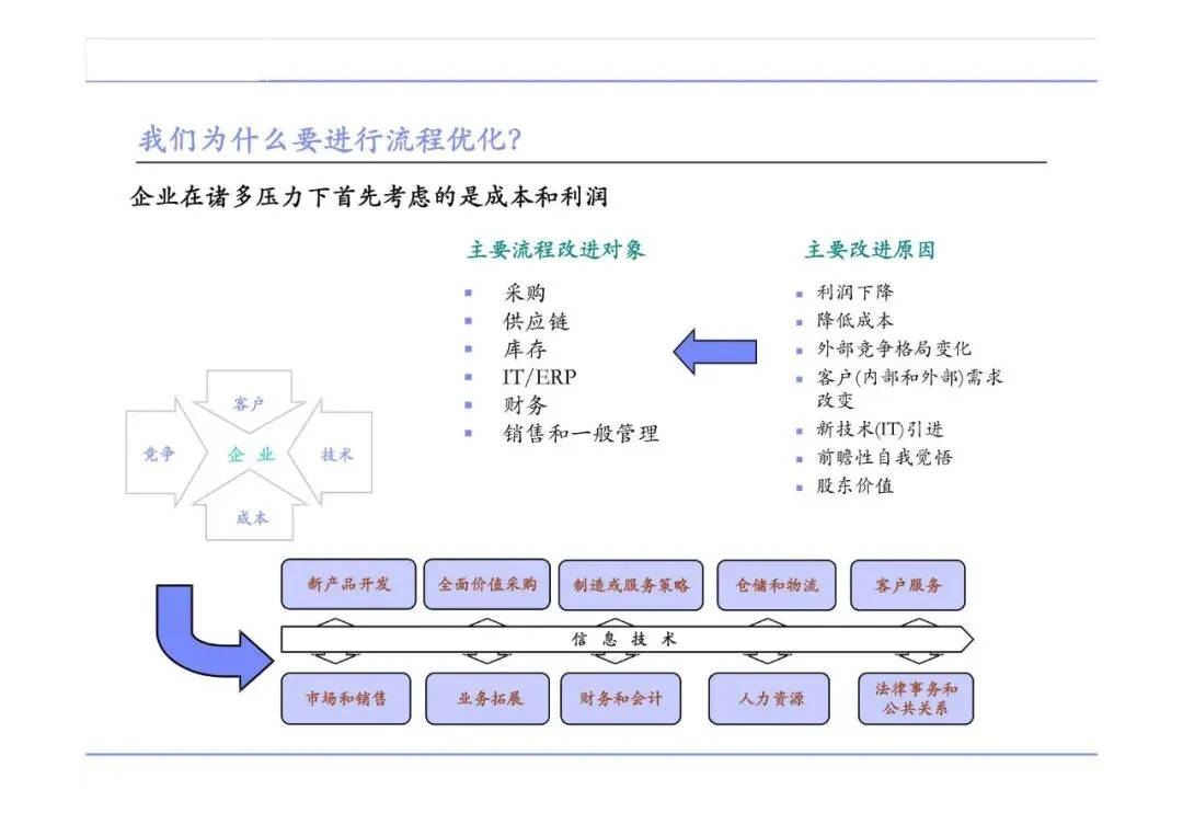 本培训方案是IBM经典的业务流程管理方法论体系,系统构建了从流程认知、流程设计到流程优化的完整知识框架,分为流程基本概念与重要流程理念、流程设计方法概述及绘制基本知识、IBM流程优化与流程持续改进方法三大模块。核心价值在于帮助企业建立“流程导向“而非“职能导向“的管理思维,通过层次化的流程架构实现从战略目标到具体执行的有效衔接,为数字化转型奠定坚实的流程基础。