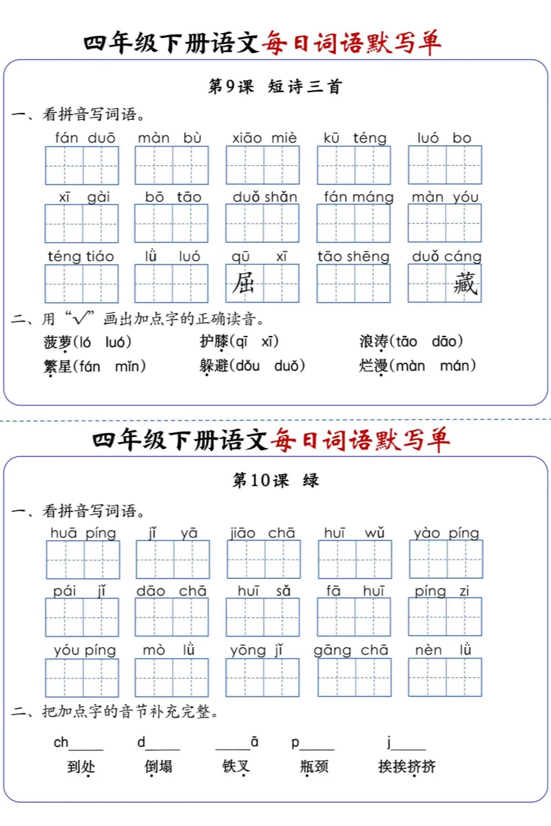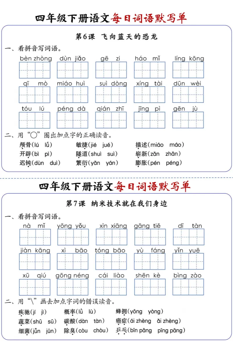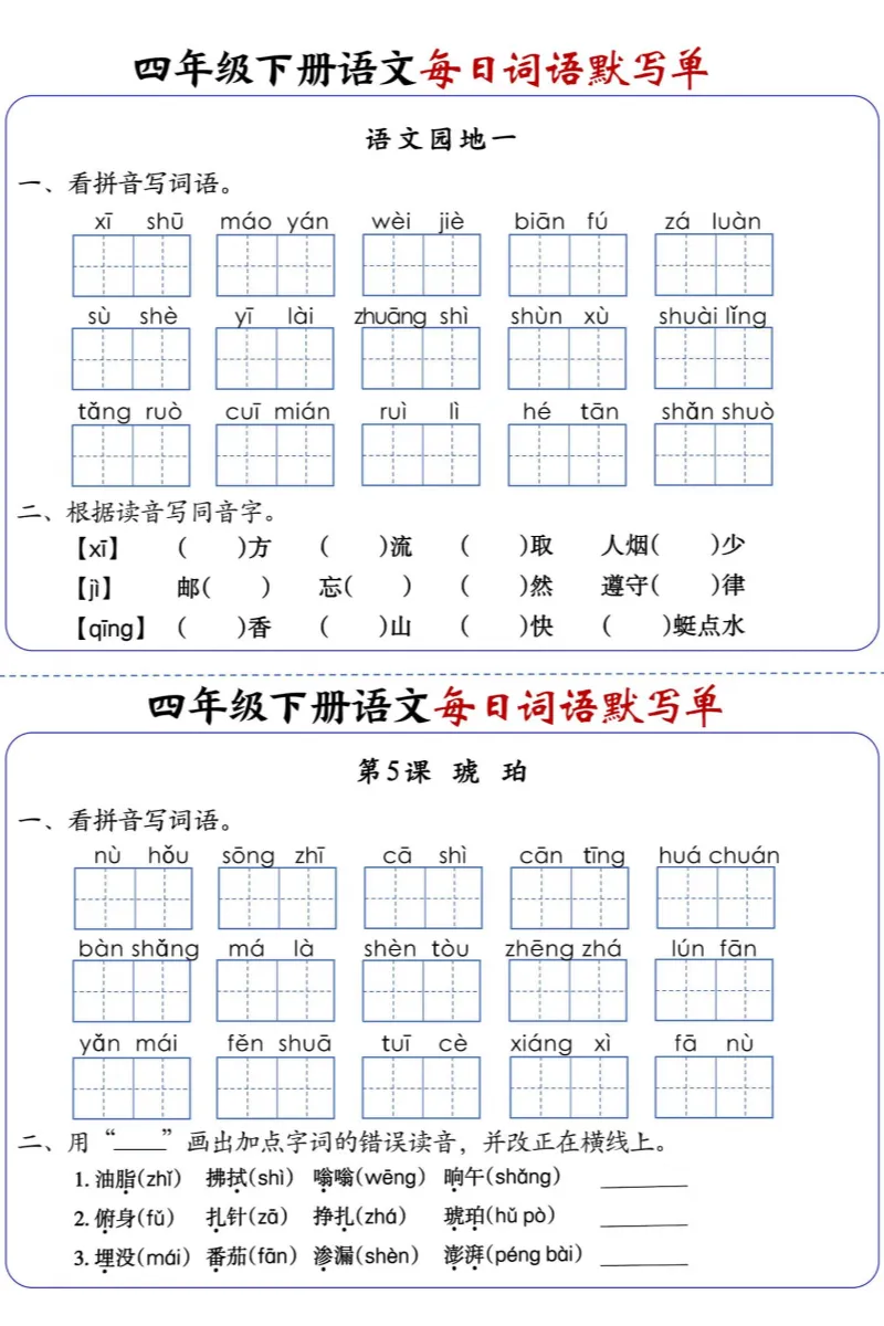 四年级下册语文《每日词语默写单》,PDF完整版含答案