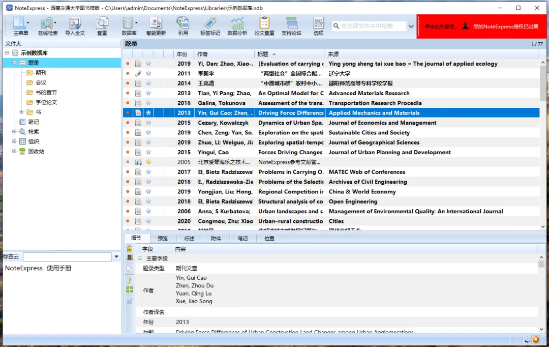 | NoteExpress(简称NE)是一款专业的文献检索与管理系统,由北京爱琴海软件公司开发。其核心功能是帮助用户收集整理文献资料,在撰写学术论文、学位论文、专著或报告时,可在正文中的指定位置方便地添加文中注释,然后按照不同的期刊格式要求自动生成参考文献索引。本平台所提供的文件均为压缩文件,如果电脑上没有此软件,可提前下载安装。 | |