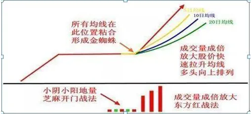 2. 三条价格平均线是指5日、10日、20日均线,三条均线在同一天汇聚在一点,发散向上,形态神似向上伸开的三条蜘蛛脚。