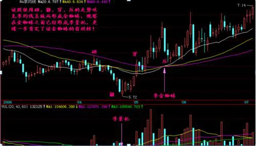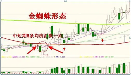 什么是“金蜘蛛”? 就是均线缠绕一起,像蜘蛛的身体,延伸的均线像蜘蛛的脚,向上就是金蜘蛛。