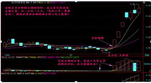 2、金蜘蛛形态,形态形成需要量能激增确认,随着股价上升,量能要成阶梯式跟进;