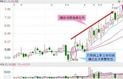 1 、“出水芙蓉”。此K线形态也是一根大阳线,但是这根大阳线上穿三条均线,使均线呈现多头排列形态,后势极端看涨。三条均线指5日10日20日,这是一个中期或波段式的上涨行情,缩量回调是买进时机。1、K线实体要大,尾盘分时不能有急跌;2、长阳上穿3条均线;3、若有过倍巨量则长阳后有回调。