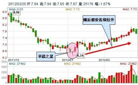 4 、“早晨之星”。此种K线图形由三根K线构成。第一日股价承接原有跌势继续下行,并出现一根实体较长的阴线;第二日股价波幅缩小,收出实体较短带上下影线的阴线或阳线,称之为“星”,这是K线组合中的主体部分;第三日收出阳线,而且上涨至第一根K线实体之内,这是转市可靠性最高,力度最强的一种K线组合。