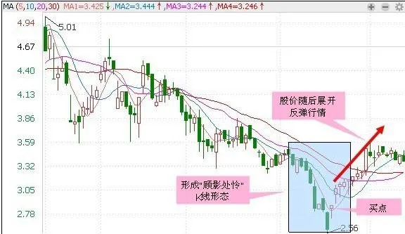 5 、“顾影处怜”。股价加速下行,在低档位拉中长阴线,恐慌盘的涌出导致最后竟跳空拉出中大阴线,但第二天大势却急转直上,直接跳高至前一日大阴的开盘价之上开盘,盘中虽有可能再探低位,但收盘价仍在前一日的开盘价之上,留下一条前后皆无K线的大阴线,在收盘之前若确定,则是较佳的低吸点,后市将快速上扬。