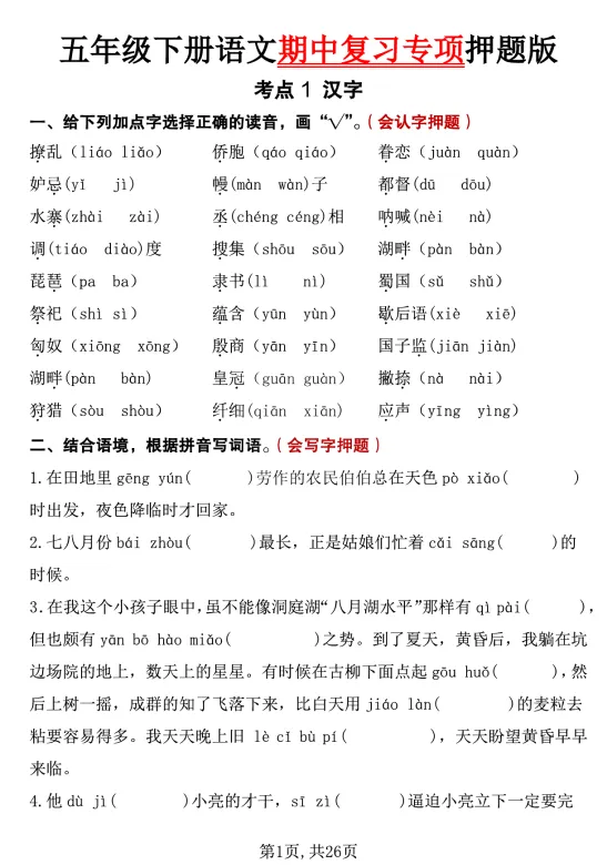 今天给大家准备好了!~五年级(下)语文 期中复习专项押题版丨可下载打印