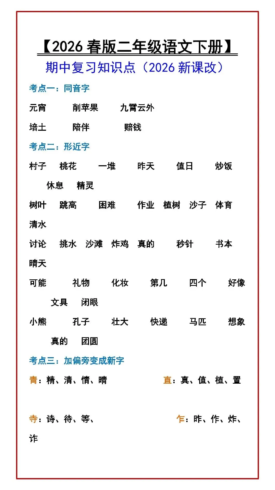 可下载丨二年级下册语文期中复习知识点,电子版可打印