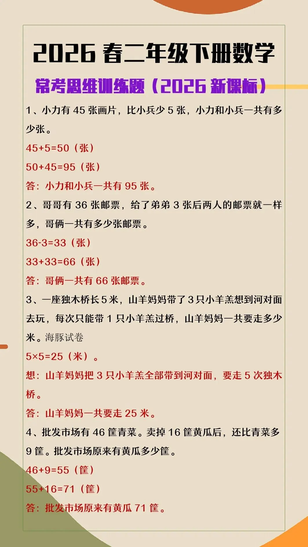 可下载丨2026春新版二年级下册数学常考思维训练题,电子版可打印